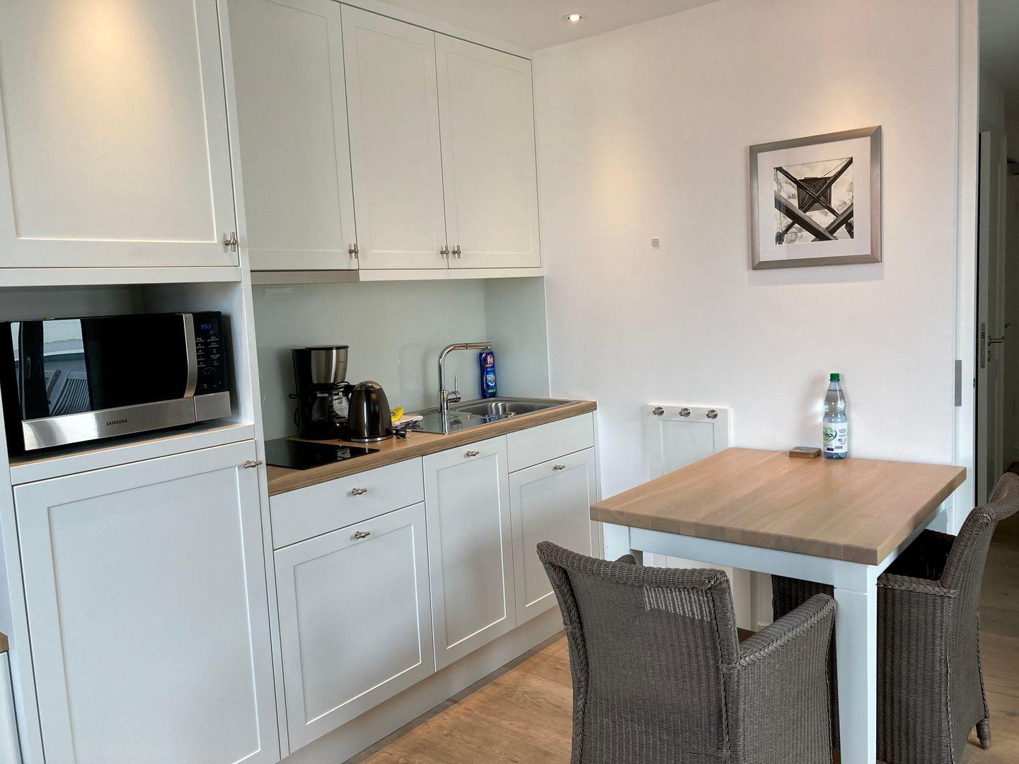 Die Offene Küche mit Ceranfeld ist ausgestattet in einen Kühlschrank, eine Mikrowelle, eine Spülmaschine, Geschirr/Besteck, Kochutensilien, eine Kaffeemaschine, einen Toaster und einen Wasserkocher.