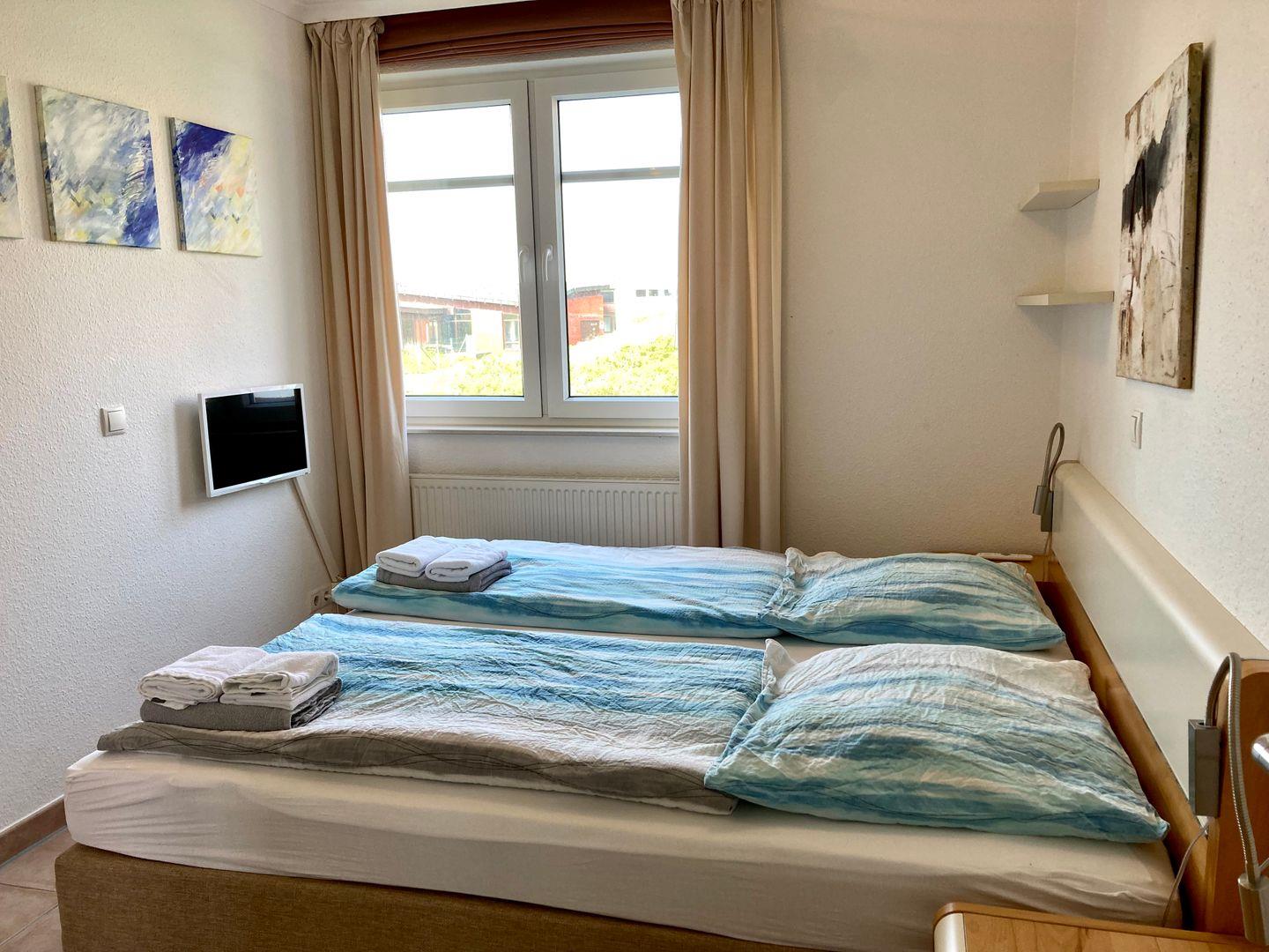Highlight neben der Sauna, ist der großzügige Westbalkon mit Strandkorb, auf dem Sie einen traumhaften Ausblick auf die Dünenlandschaft bis hin zum Westturm haben.