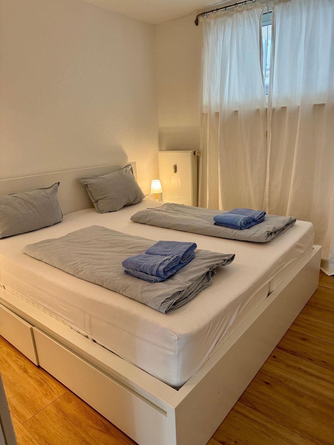 In dieser Ferienwohnung erwarten Sie ein separates Schlafzimmer (welches ruhig, nach hinten raus gelegen ist) mit Fenster und großzügigem Schwebetürenkleiderschrank.