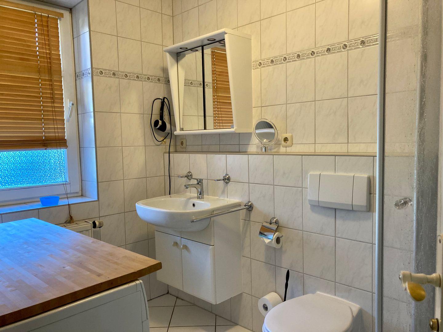 Im Erdgeschoss befindet sich ein Duschbad mit Waschmaschine, Trockner und Fenster.