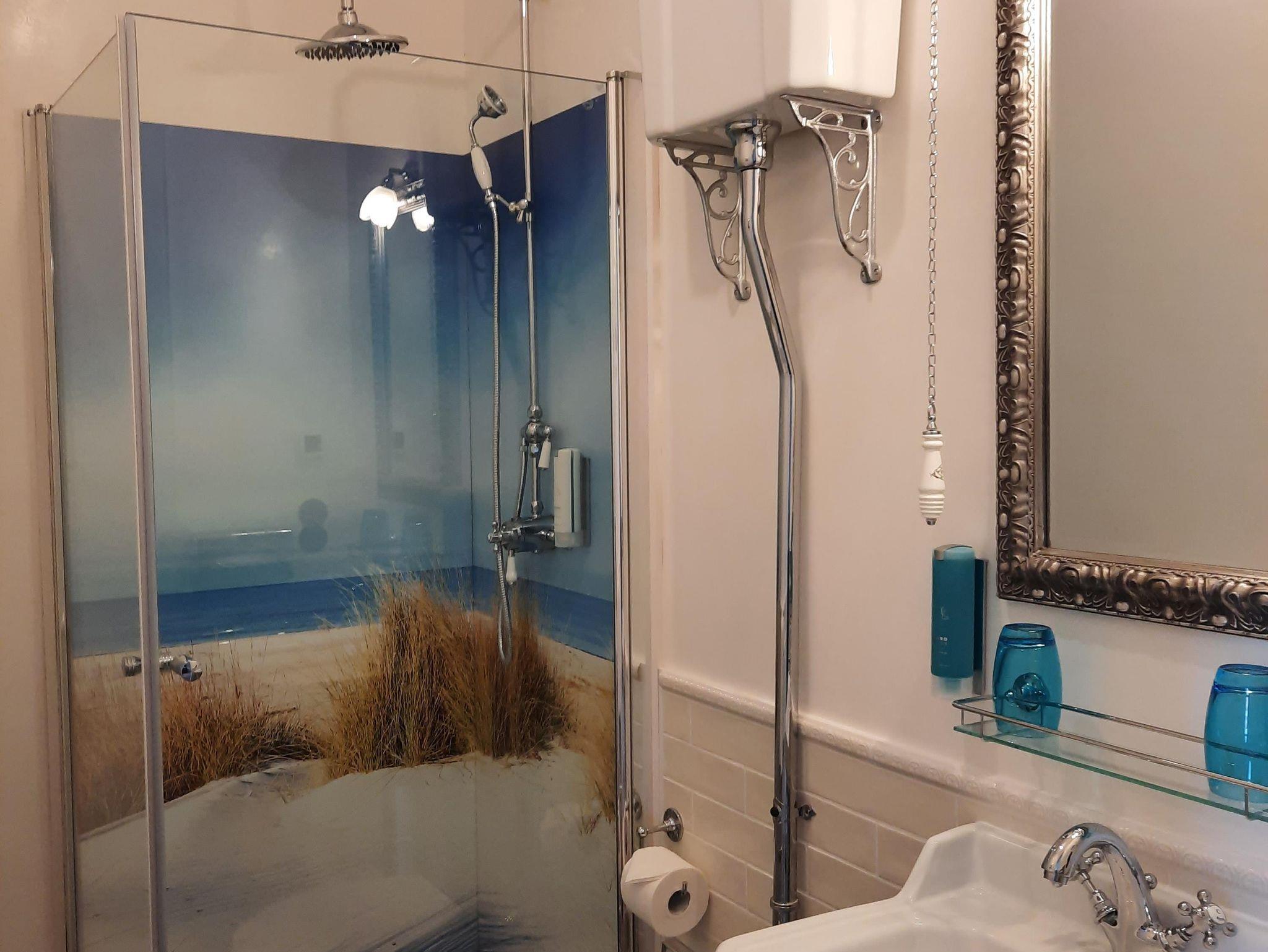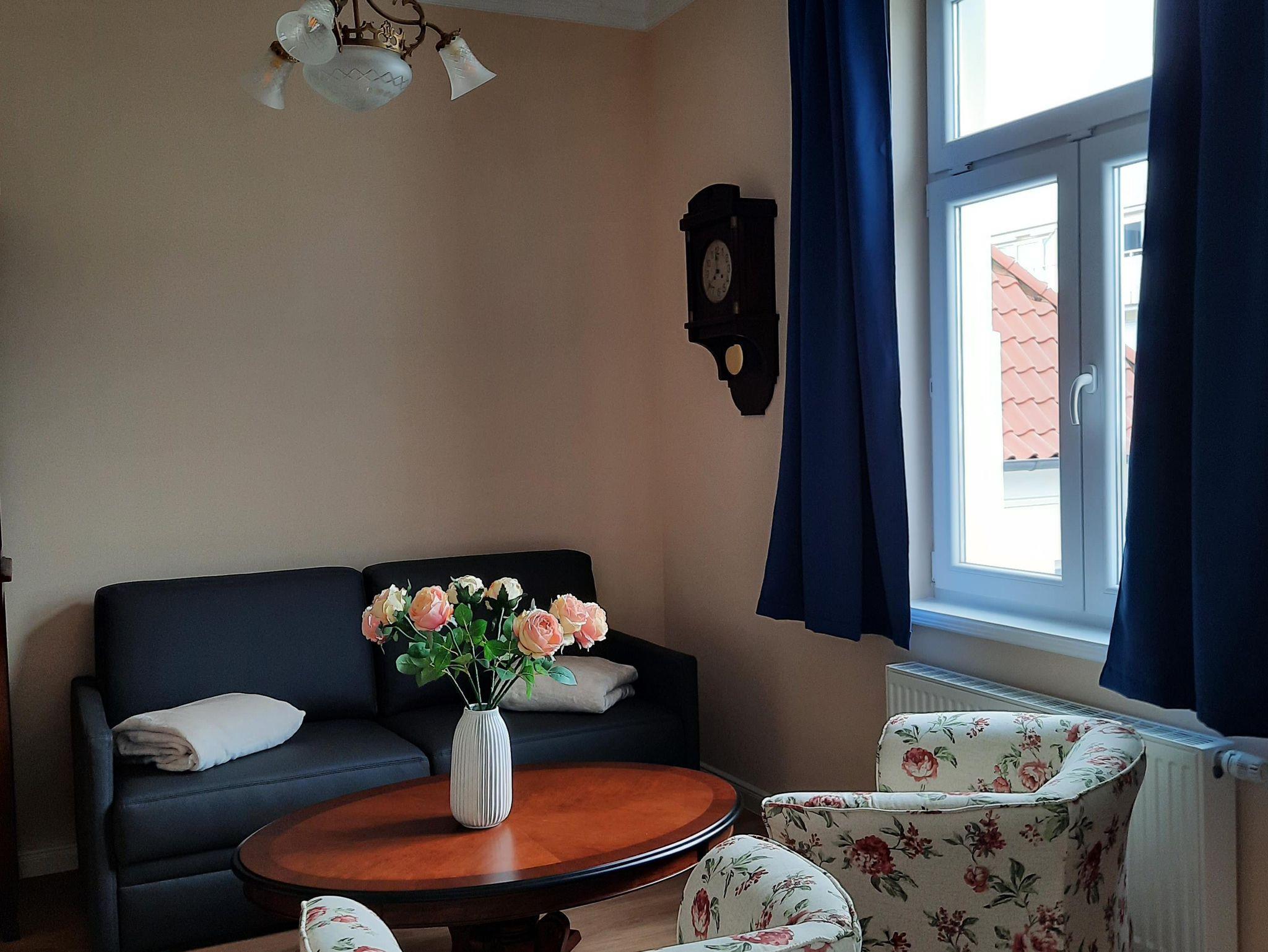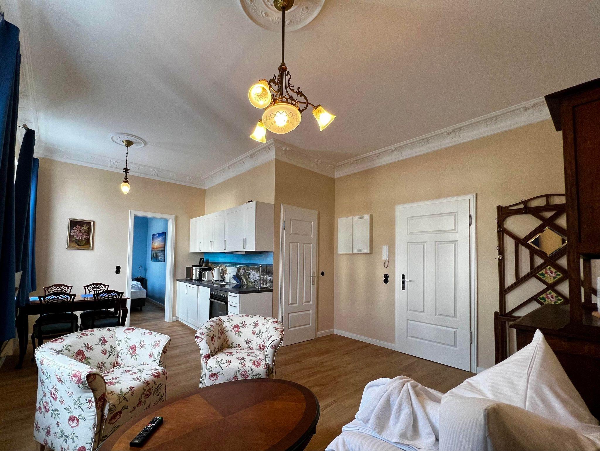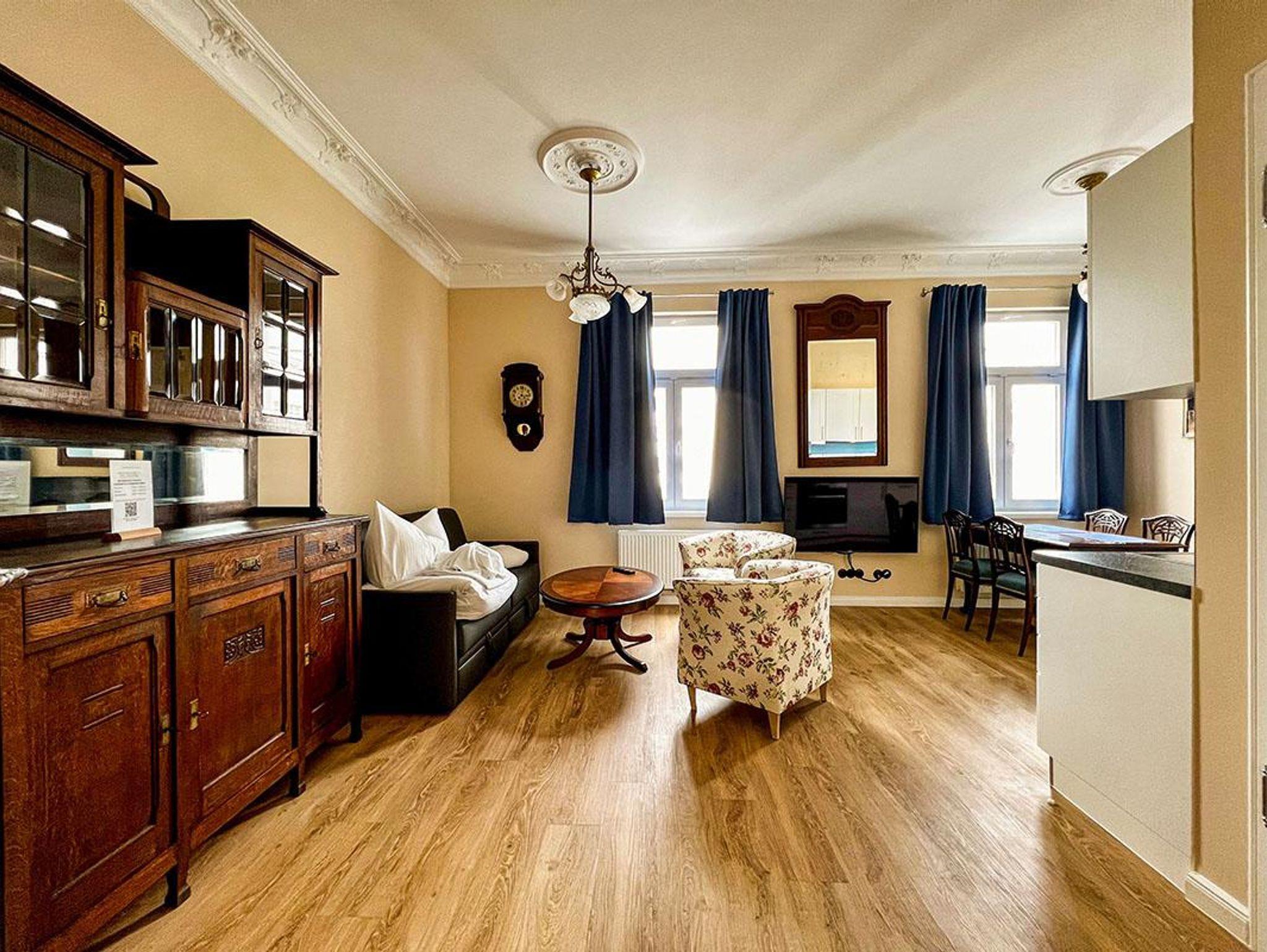 Die Architektur sowie die hochwertigen, restaurierten Möbel aus der Zeit der Jahrhundertwende vermitteln ein reizvolles Jugendstil-Ambiente, was es so auf der Insel kein zweites Mail gibt. Gleichzeitig ermöglicht Ihnen eine moderne technische Ausstattung, Ihren Alltag in gewohntem, zeitgemäßem Komfort zu führen. In den Betten, für die wir eine hochwertige Hotel-Qualität gewählt haben, werden Sie erholsamen Schlaf finden. Die Wohnung Strandläufer verfügt über hohe Decken, Blick zum Meer und weiten Blick über die Ortsstraße.