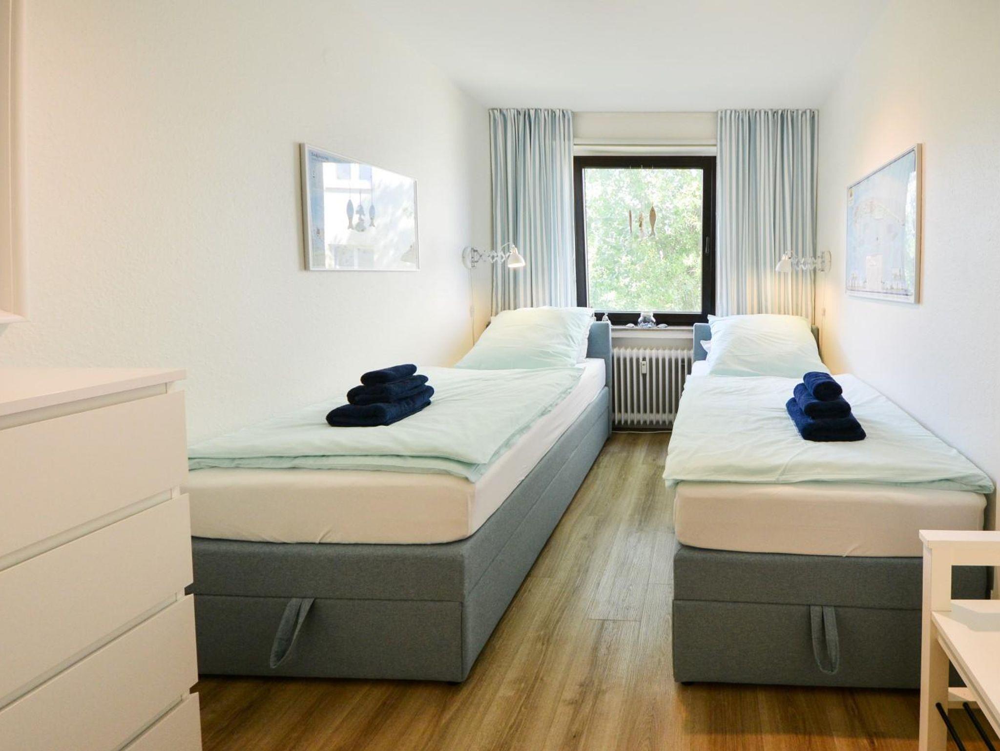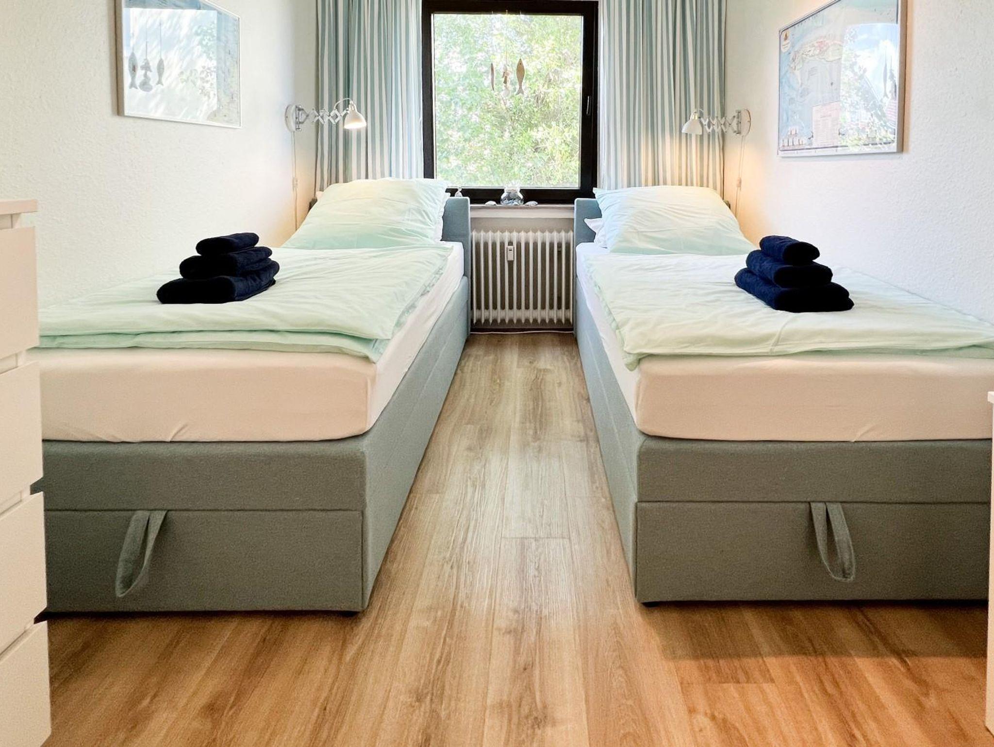 Gemütliche FeWo im Hochparterre. Helles, modernes Wohnzimmer mit hochwertigem Schlafsofa mit Longchair, Esstisch mit 5 Plätzen, Sideboard mit internetfähigem Kabel-TV (41''), Bluetooth-Radio mit CD. Westbalkon mit Sonne von Mittag bis Sonnenuntergang, Wäscheständer. Schlafzimmer mit 90 cm-Boxspring-Betten mit Topper (auf Wunsch zusammen oder getrennt gestellt, bitte bei der Buchung angeben). Anti-allergisches Bettzeug mit hochwertiger Bio-Baumwollbettwäsche. Komplett ausgestattete Küche. Heller Flur mit ausreichend Stauraum. Bad mit WC und Runddusche (75 cm). Handtücher mit Ökotex-Siegel.