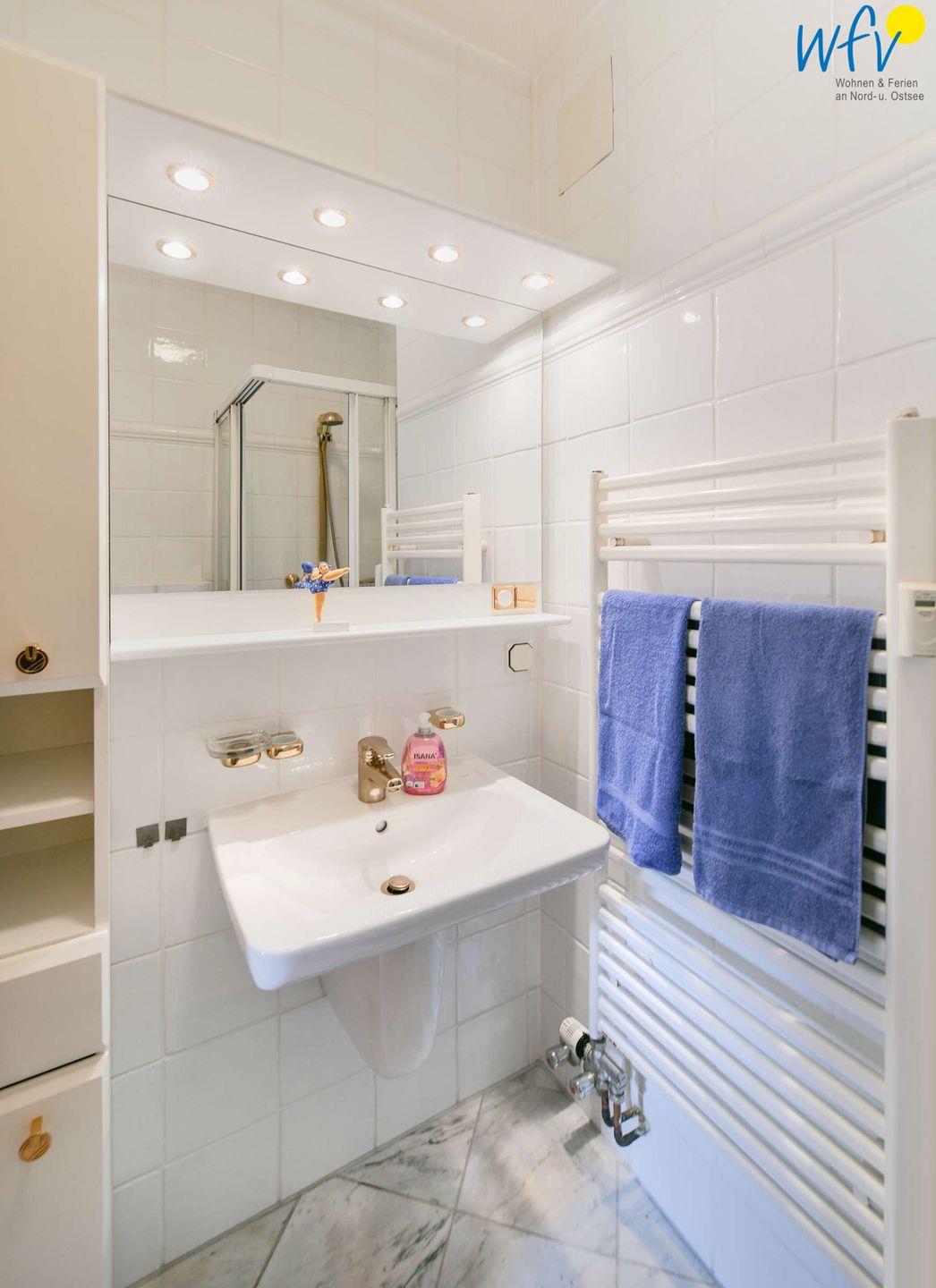 Ein sehr gepflegtes Bad mit Dusche und Handtuchheizung rundet den Wohnkomfort ab.