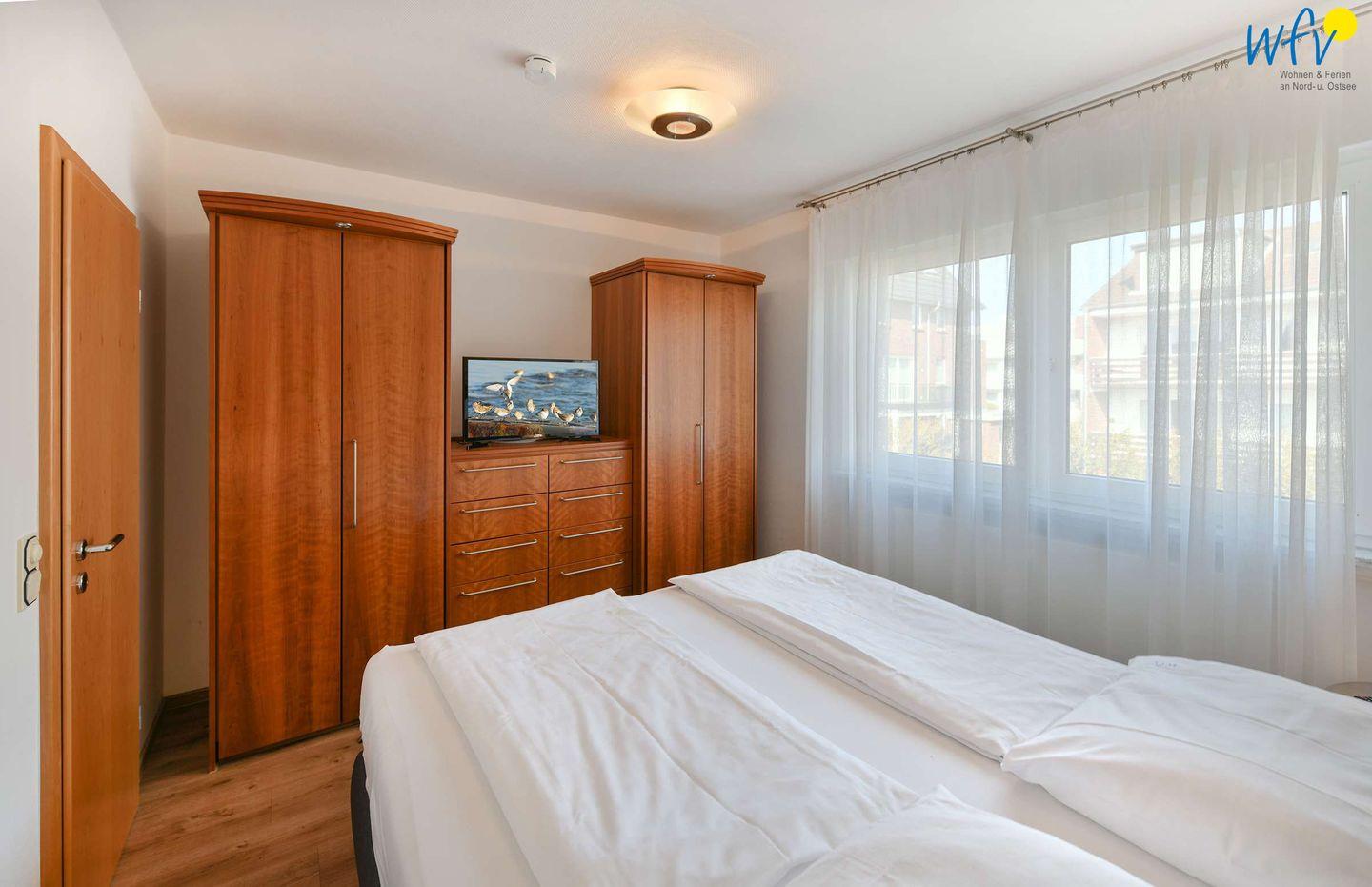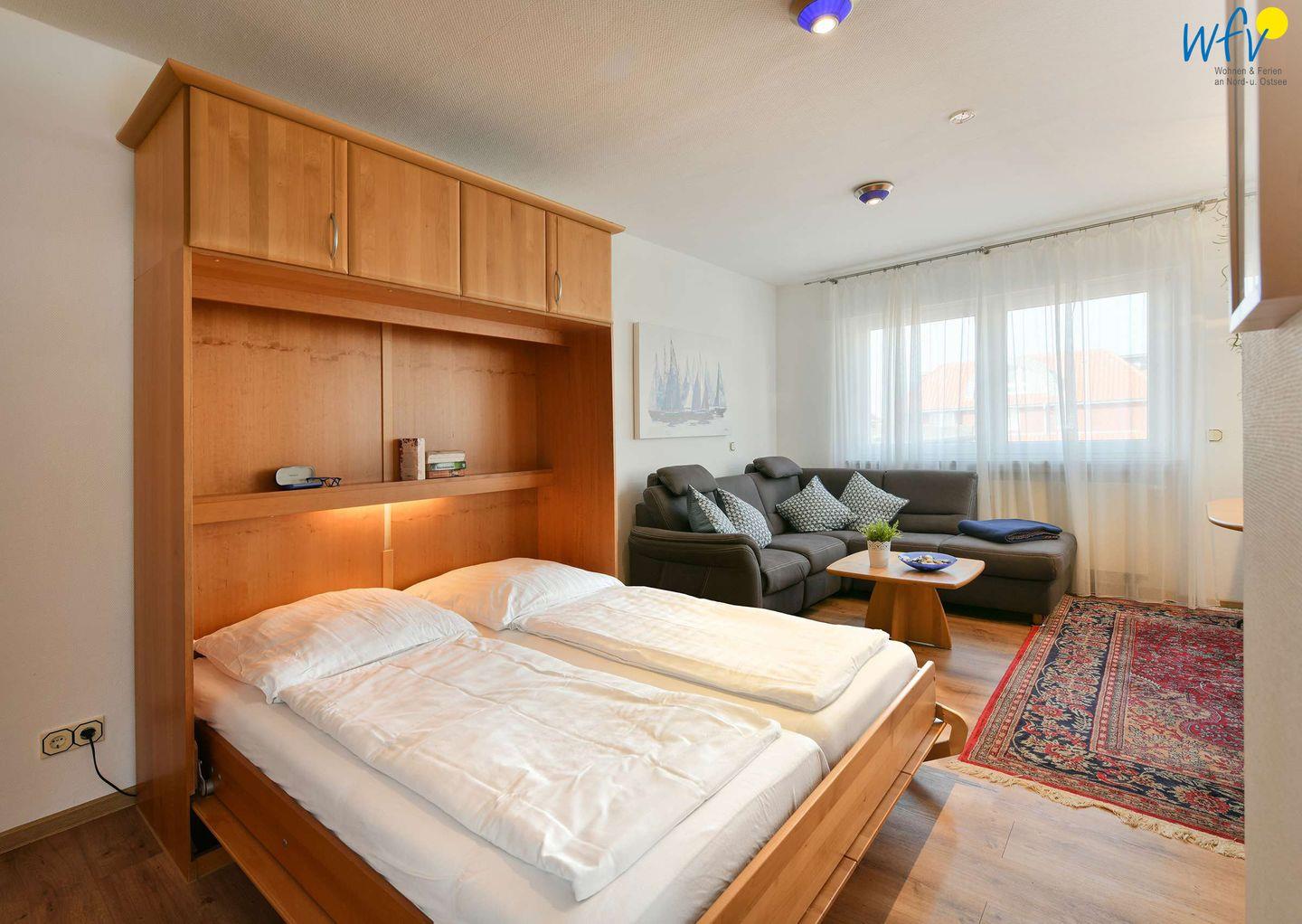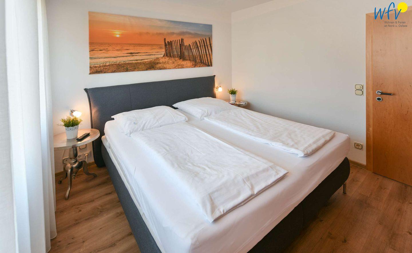 In dem separaten Schlafzimmer unserer Ferienwohnung auf Wangerooge befindet sich ein komfortables Doppelbett (180 x 200 cm). Zwei weitere Schlafmöglichkeiten bestehen durch zwei Schrankbetten im Wohnraum (je 90 x 200 cm).