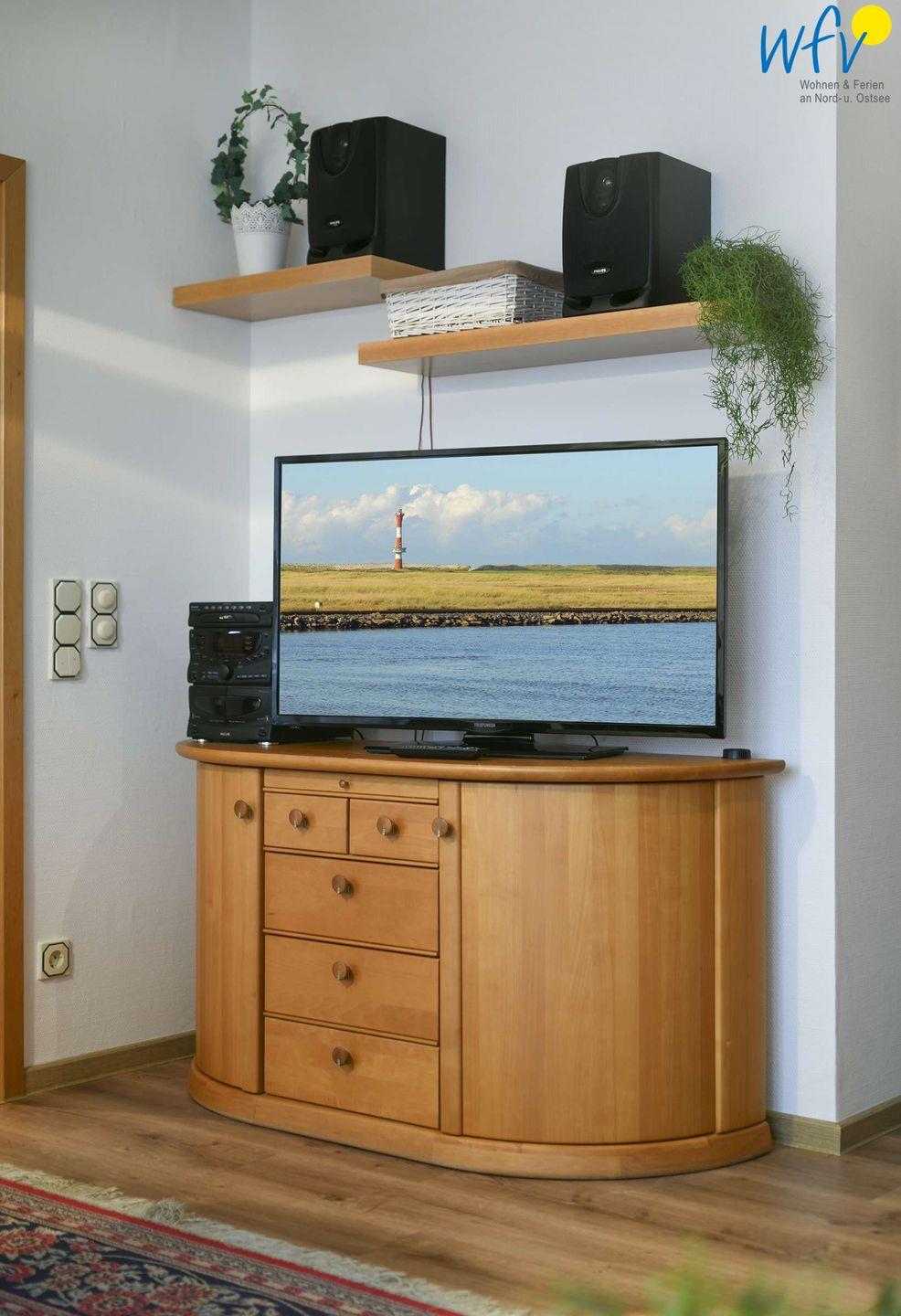Gelegenheit zum Entspannen bietet auch der helle Wohnraum, der mit einer gemütlichen Couchecke mit TV ausgestattet ist. Auch im Schlafzimmer können Sie fernsehen. Kostenlos empfangen Sie in der gesamten Ferienwohnung freies Wlan.