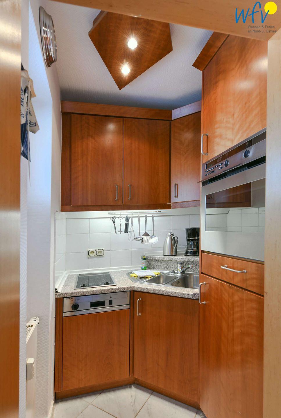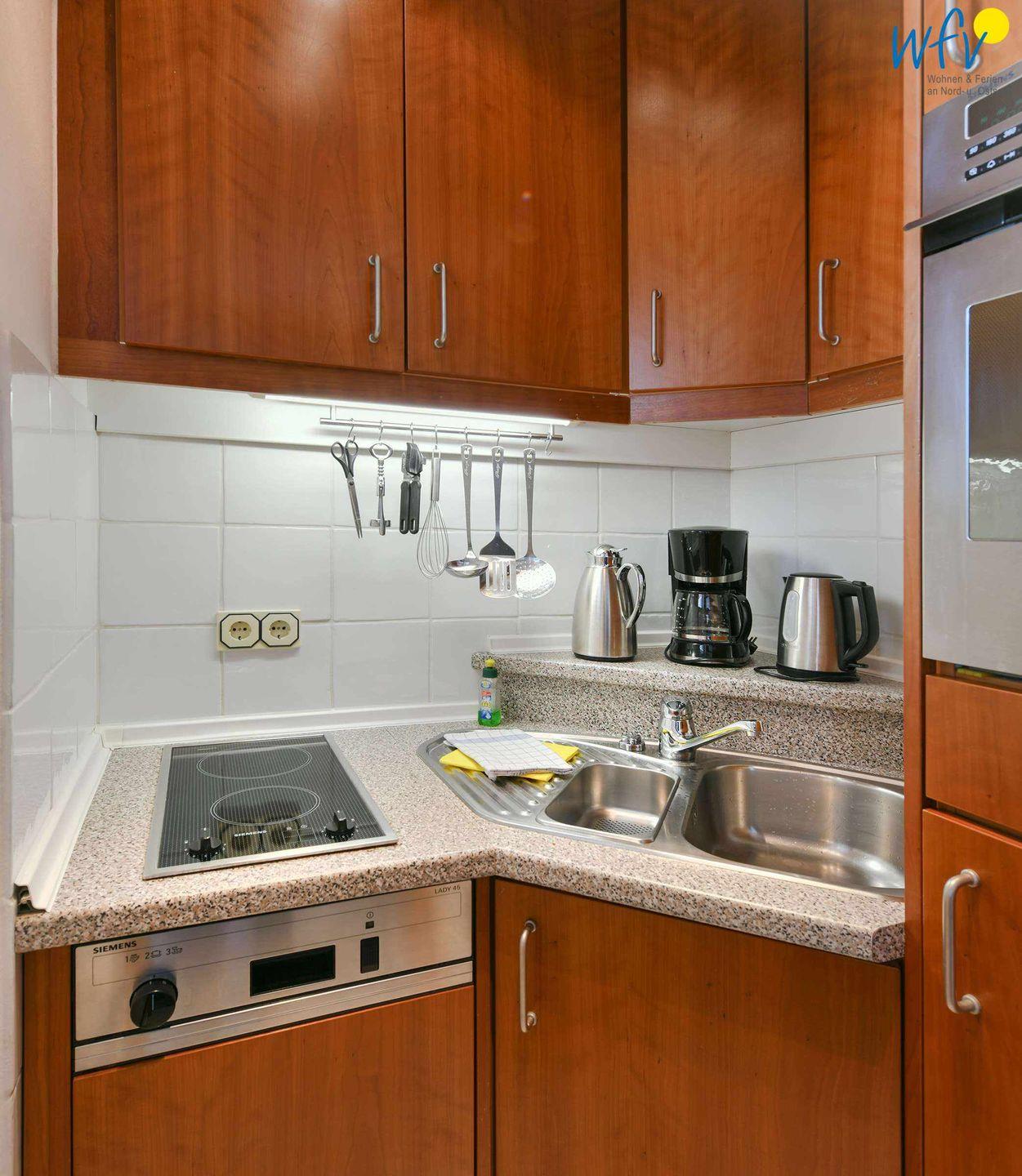 Damit Sie sich in Ihrem Urlaub auf Wangerooge bequem selbst verpflegen können, verfügt die Wohnung über eine moderne Einbauküche - u.a. mit 2-Plattenherd, Backofen, Kühlschrank mit Gefrierfach, Spülmaschine und Mikrowelle sowie Kaffeemaschine, Wasserkocher und Toaster.