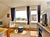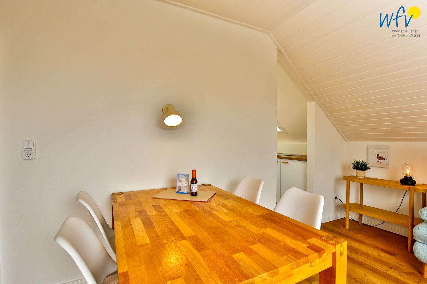Damit Sie sich in Ihrem Urlaub auf Wangerooge bequem selbst verpflegen können, verfügt die Ferienwohnung über eine gut ausgestattete Küche - u.a. mit einem 2-Platten-Ceranherd und einem Kühlschrank mit Gefrierfach. Diverse Kleingeräte wie Kaffeemaschine, Wasserkocher, Eierkocher und Toaster sind selbstverständlich auch vorhanden. Für gemeinsame Mahlzeiten befindet sich im Wohnraum ein gemütlicher Essplatz.