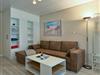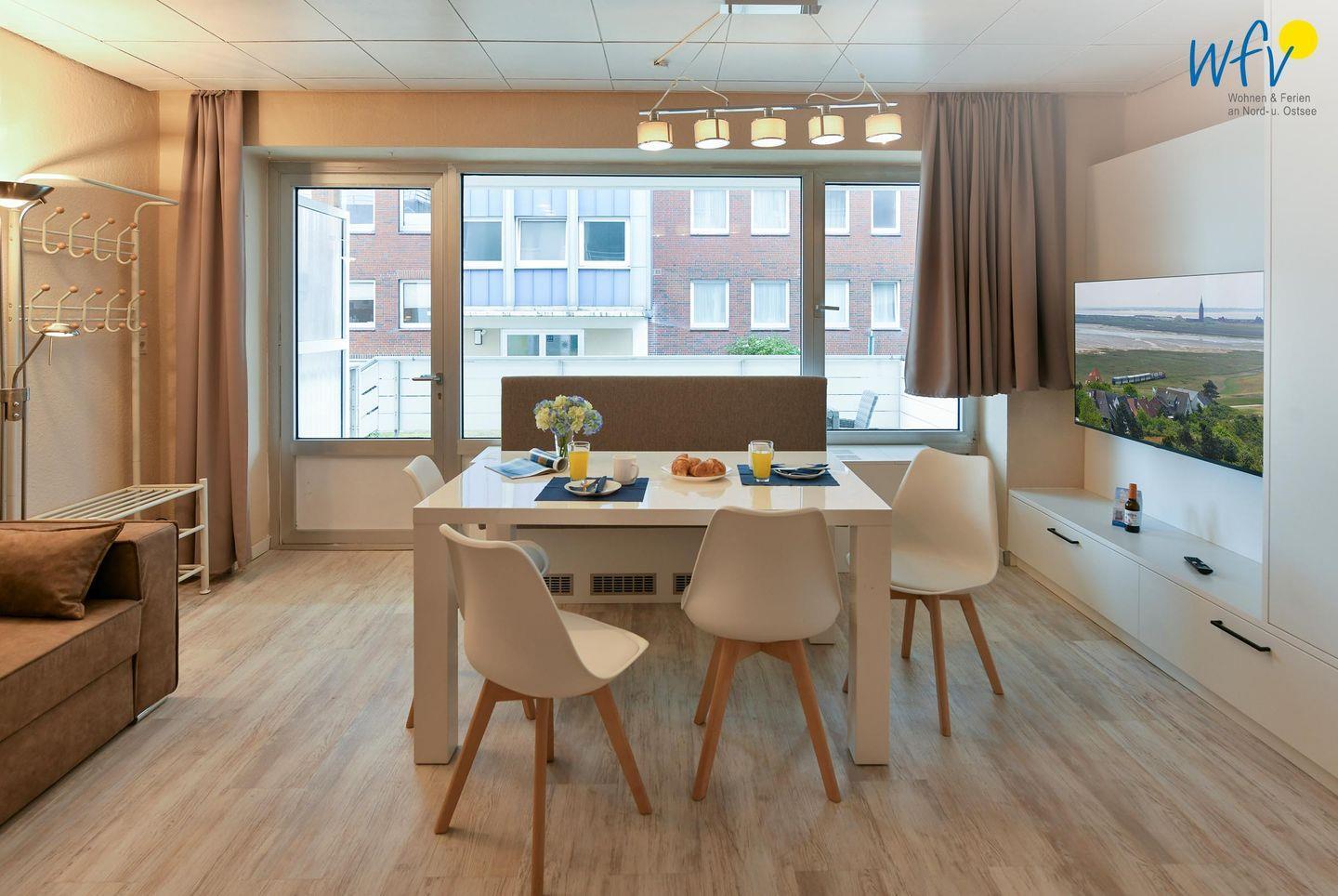 Für erholsame Zeiten in Ihrem Wangerooge-Urlaub ist das Wohnzimmer mit einer bequemen Couchecke mit TV eingerichtet. So können Sie ausgiebig entspannen und gemütlich den Urlaubstag ausklingen lassen. Durch eine große Fensterfront besitzt dieses Zimmer einen schönen Lichteinfall und damit eine freundliche Atmosphäre.