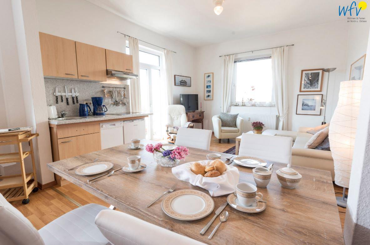 Haus Colonia Ferienwohnung 8 auf Wangerooge bietet auf 50 m² einen offenen Wohn- und Essbereich, ein separates Schlafzimmer sowie eine voll ausgestattete Küche mit Ceranherd, Spülmaschine und Mikrowelle. Die Unterkunft verfügt über eine überdachte Terrasse, ist kinderfreundlich, für Haustiere geeignet und komplett für Nichtraucher ausgelegt.