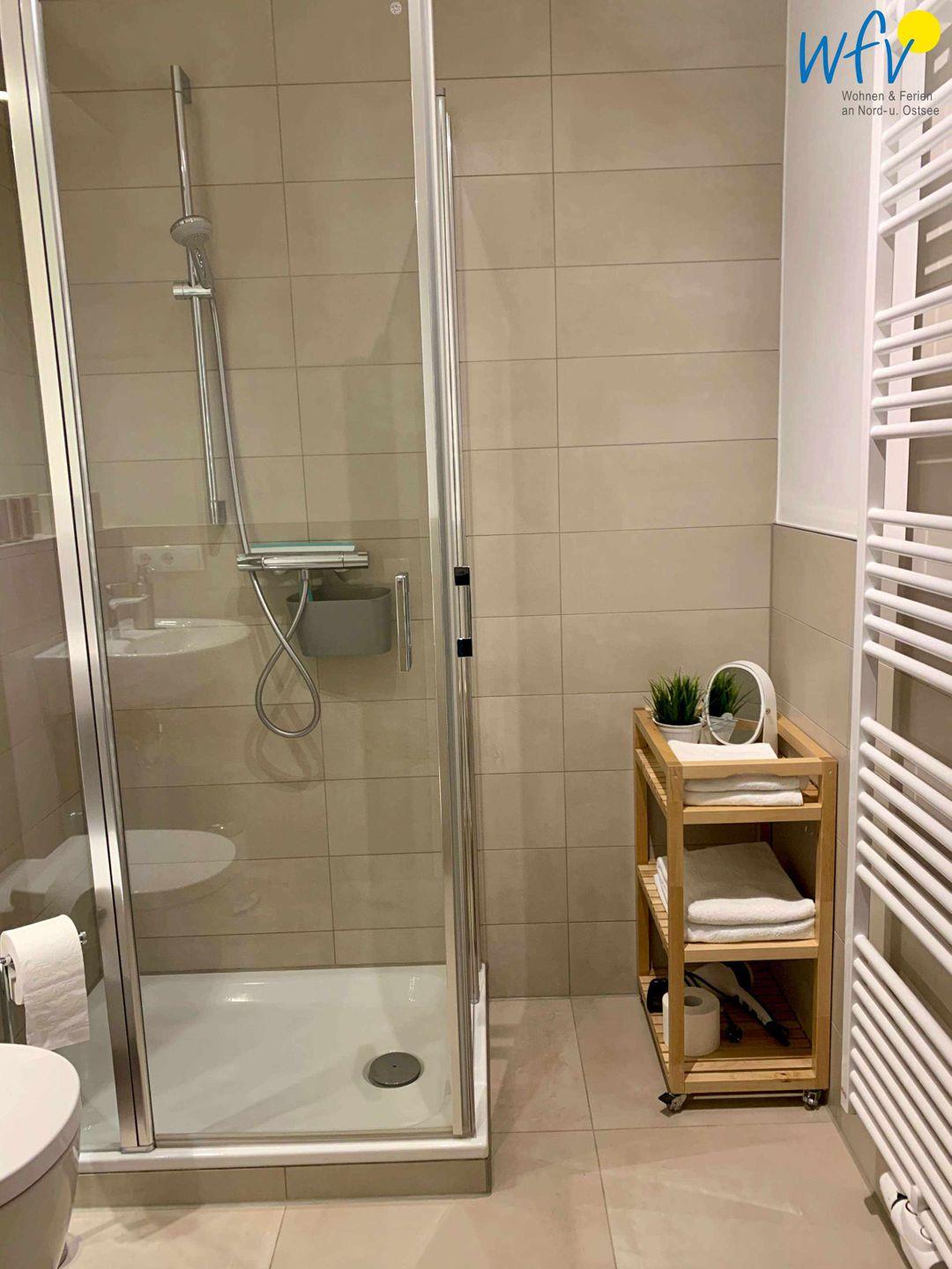 Für gehobenen Wohnkomfort sorgt auch die Ausstattung des modernen Badezimmers - u.a. eine Glas-Dusche, ein großer Wandspiegel und eine Handtuchheizung.