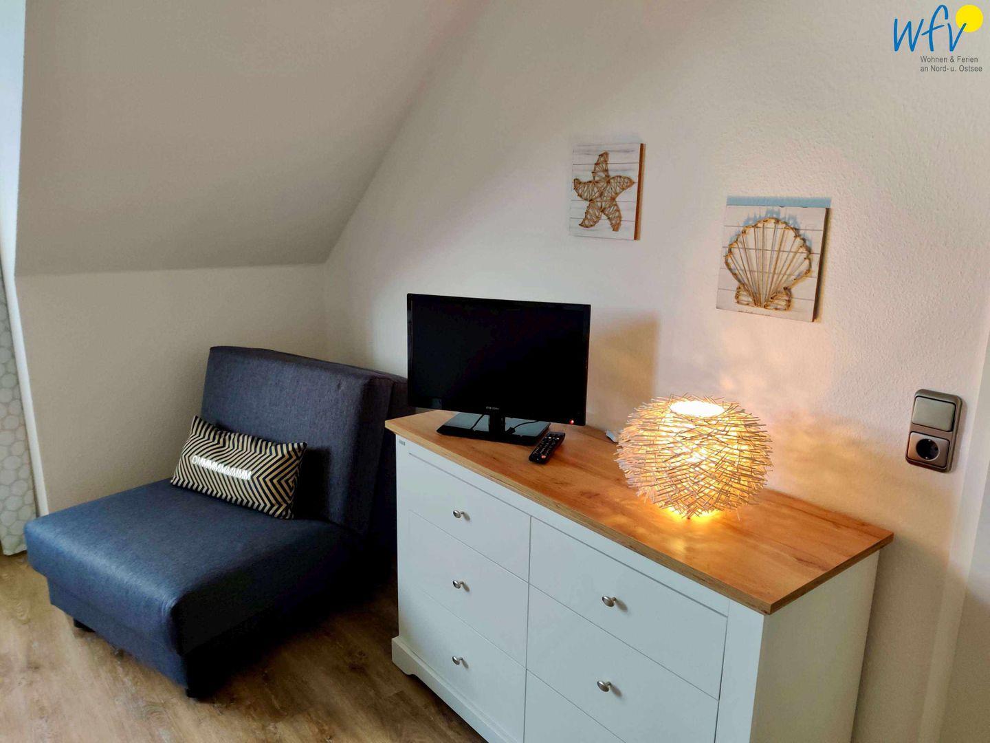 In dem oberen Bereich der Ferienwohnung auf Wangerooge erwartet Sie ein separates Schlafzimmer, das mit einem komfortablen Doppelbett (2 x 90 x 200), einem geräumigen Kleiderschrank, einer Kommode mit TV und einem kleinen Schreibtisch ausgestattet ist. Ein ausziehbarer Schlafsessel (80 x 200) bietet eine weitere Schlafmöglichkeit (für Kinder). Durch die großen Fenster und den schönen Blick ins Grüne werden Sie bereits beim Aufstehen entspannt in den neuen Urlaubstag starten!