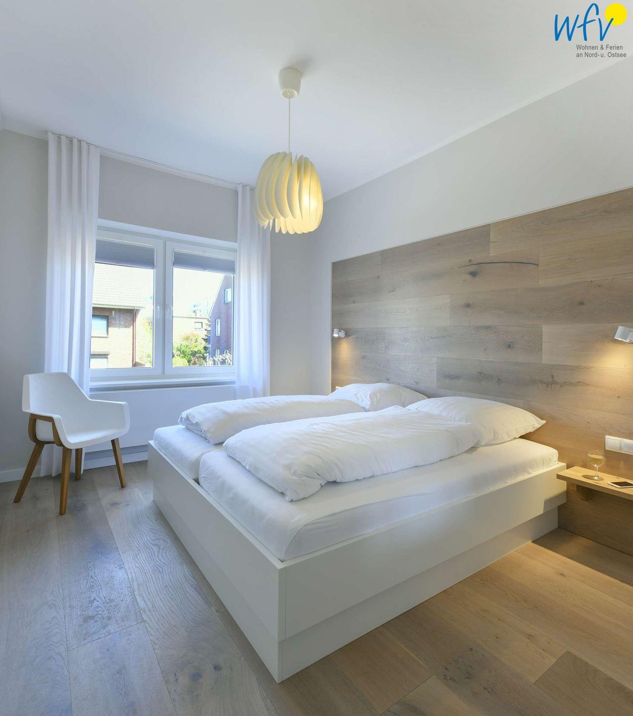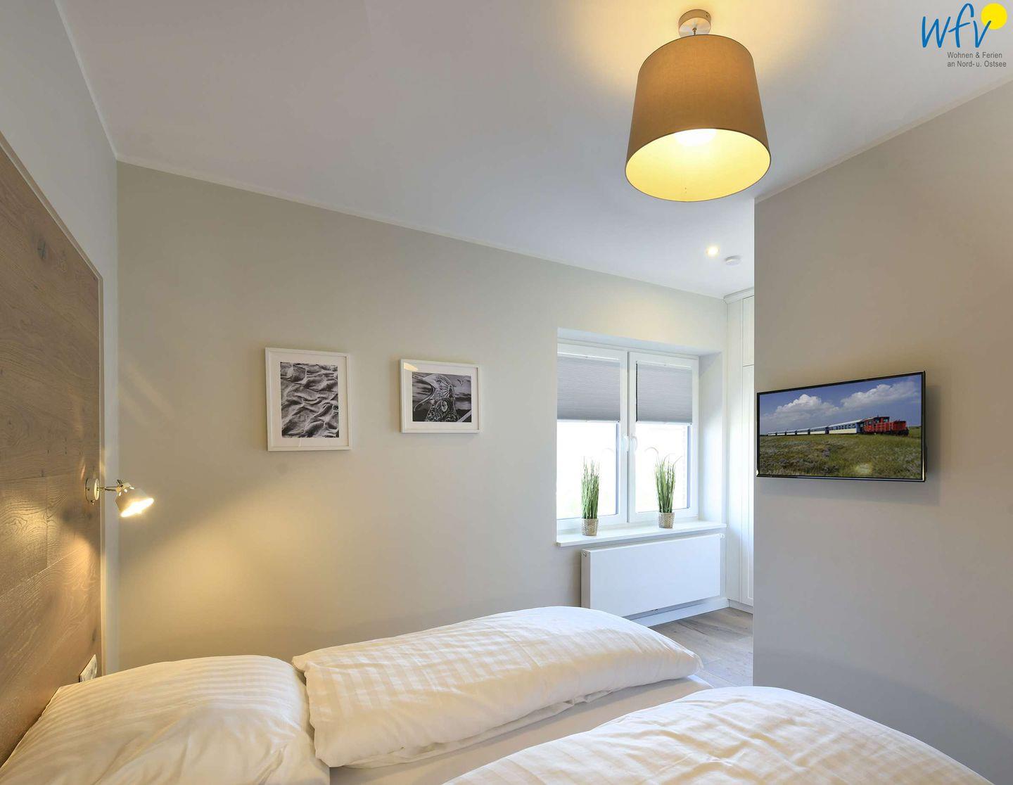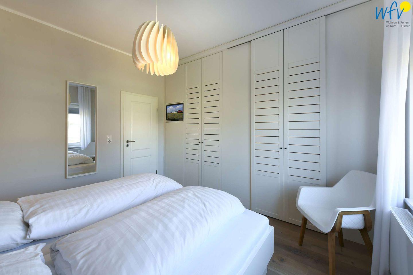 Die zwei separaten Schlafzimmer der Ferienwohnung auf Wangerooge sind mit bequemen Doppelbetten (180 x 200 cm) ausgestattet. In beiden Zimmern befinden sich ein Flat-TV und ein geräumiger Kleiderschrank. Eines der beiden Schlafzimmer ist erweitert um ein Alkovenbett (90 x 200 cm). Gerne stellen wir Ihnen ein Kinderbett und einen Kinderhochstuhl zur Verfügung (gegen eine Gebühr von je 15 €).