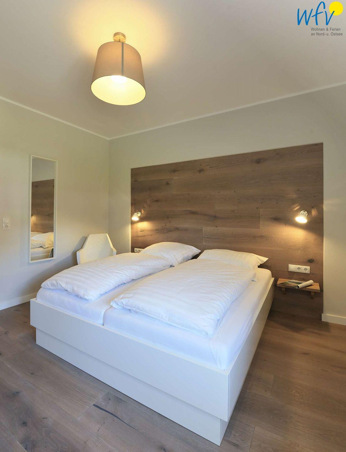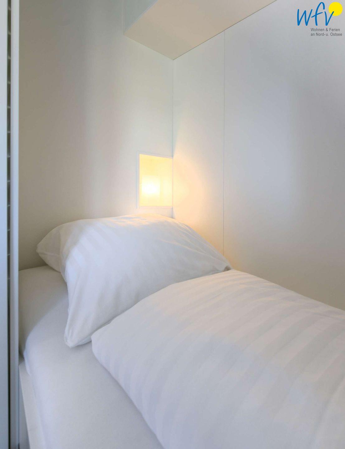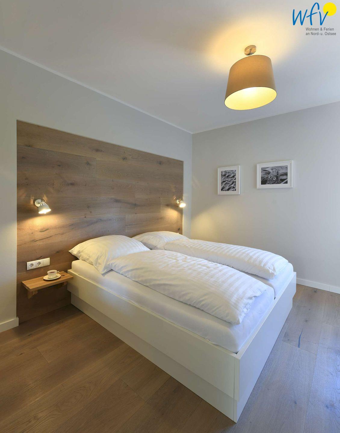 Die zwei separaten Schlafzimmer der Ferienwohnung auf Wangerooge sind mit bequemen Doppelbetten (180 x 200 cm) ausgestattet. In beiden Zimmern befinden sich ein Flat-TV und ein geräumiger Kleiderschrank. Eines der beiden Schlafzimmer ist erweitert um ein Alkovenbett (90 x 200 cm). Gerne stellen wir Ihnen ein Kinderbett und einen Kinderhochstuhl zur Verfügung (gegen eine Gebühr von je 15 €).