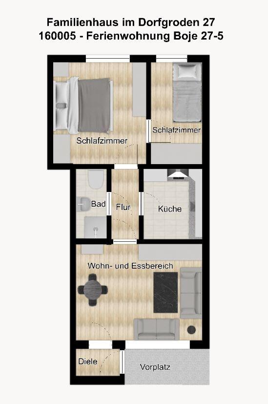 Herzlich Willkommen in unserer Ferienwohnung „Boje“! Sie ist mit zwei separaten Schlafzimmern und einem Wohn- Esszimmer sowie mit einer separaten Küche, einem Duschbad und einer Terrasse ideal für den Familienurlaub.