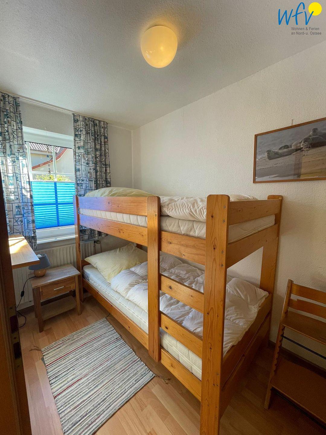 Ausschlafen können Sie in Ihrem Urlaub auf Wangerooge ganz wunderbar in den zwei gemütlichen separaten Schlafzimmern! Eines ist mit einem Doppelbett ausgestattet (2 x 80 x 200 cm), das andere mit einem Stockbett (2 x 90 x 200 cm). Für Ihre Urlaubsgarderobe gibt es ausreichend Platz in den Kleiderschränken. Die Zimmer lassen sich selbstverständlich abdunkeln.