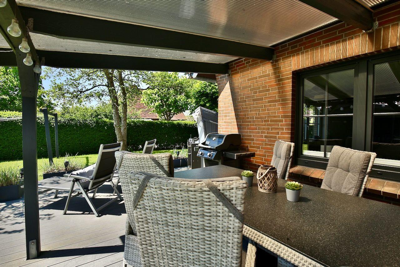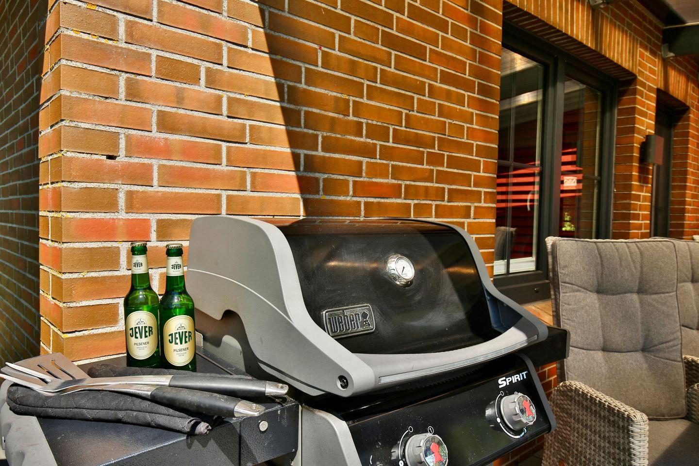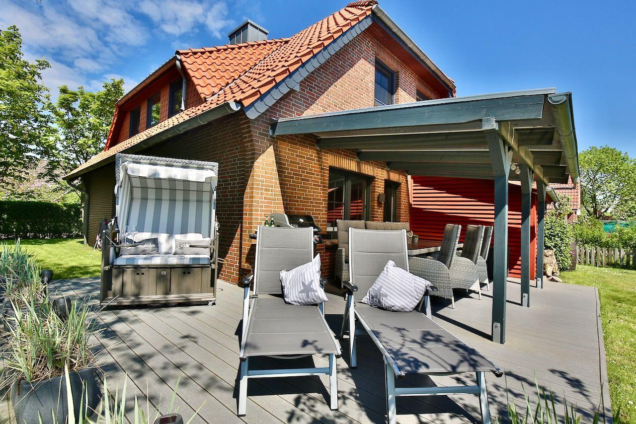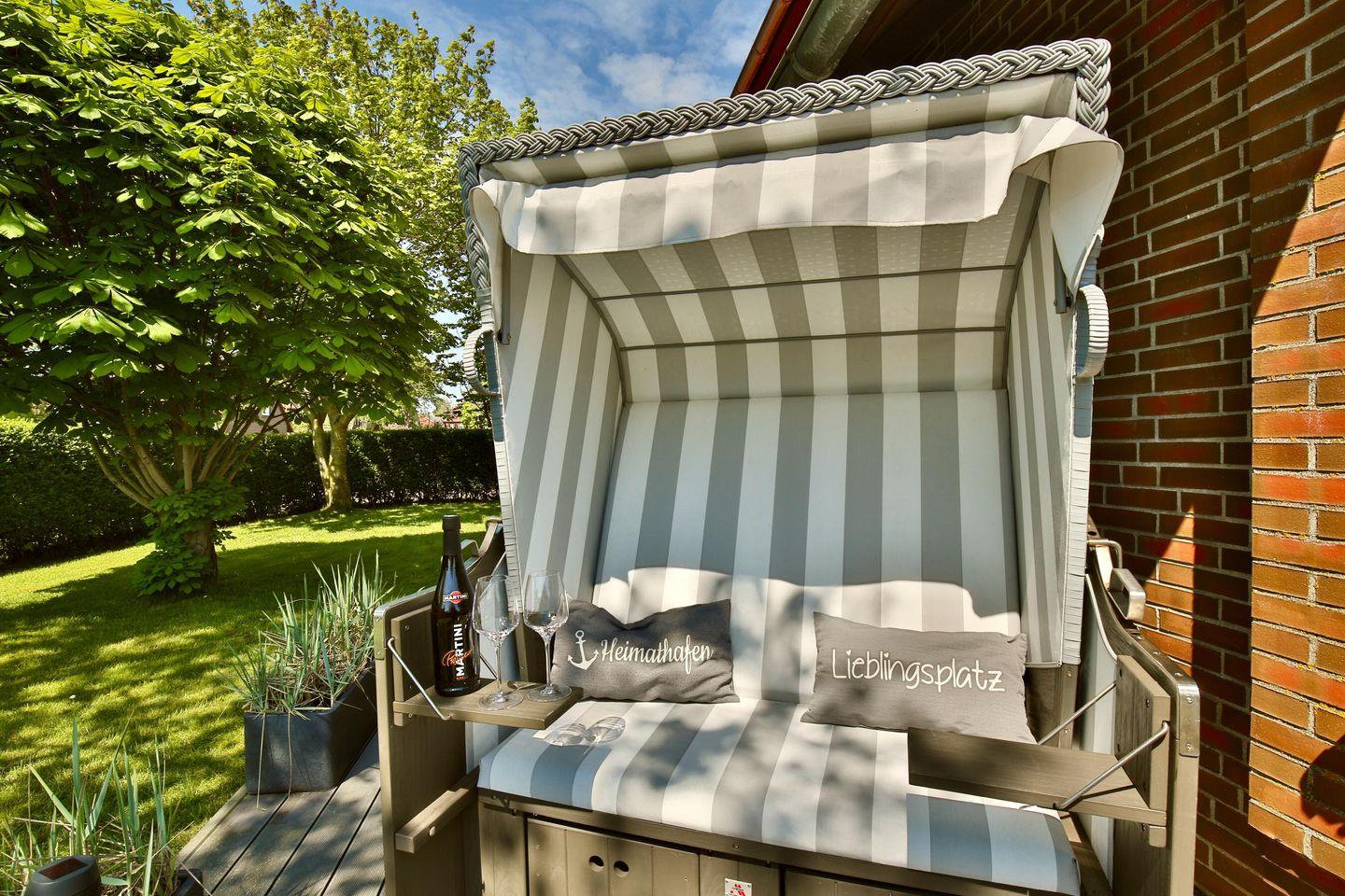 Vom Wohnbereich aus eröffnet sich auch der Zugang auf die südlich gelegene möblierte 35 m² große und überwiegend überdachte Terrasse mit eigenem Strandkorb und eigenen Strandliegen. Ein Weber-Gas-Grill lässt kaum mehr Wünsche übrig.