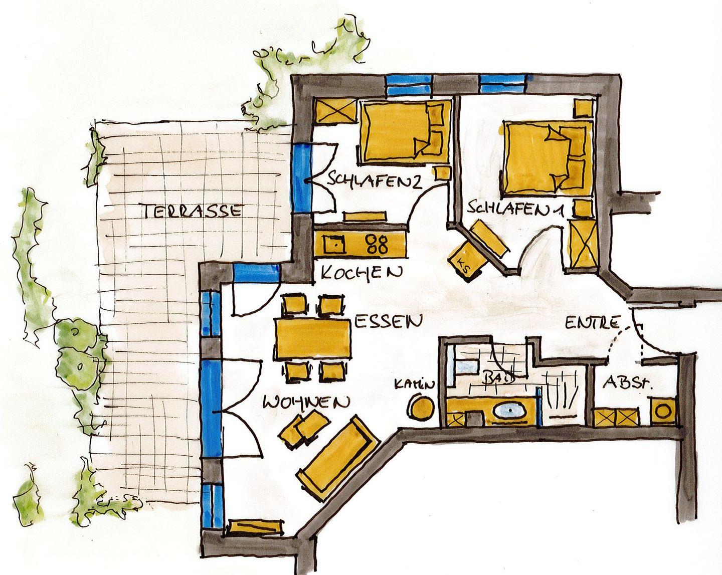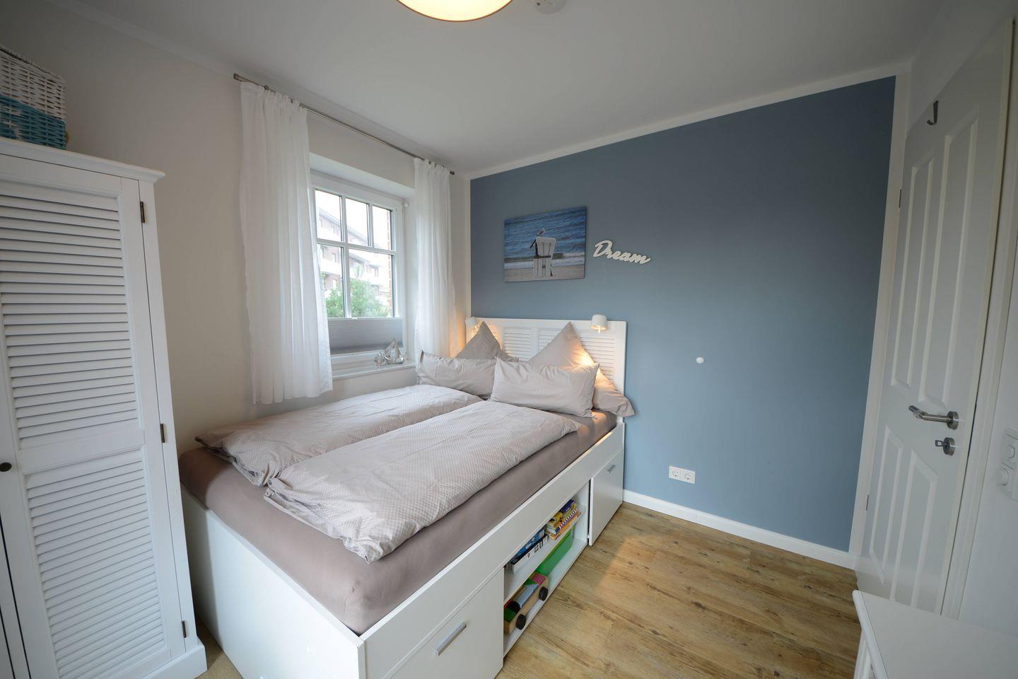 Die Ferienwohnung besteht aus insgesamt drei Zimmern, darunter zwei einladende Schlafzimmer, die eine erholsame Nachtruhe garantieren. Die geschmackvolle Einrichtung und die großen Fenster sorgen für viel Tageslicht und schaffen eine angenehme Atmosphäre.