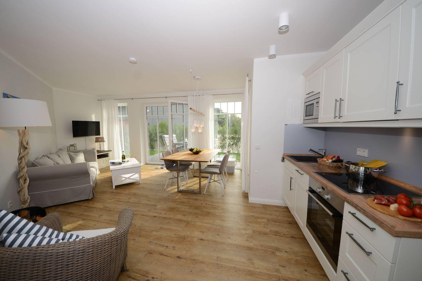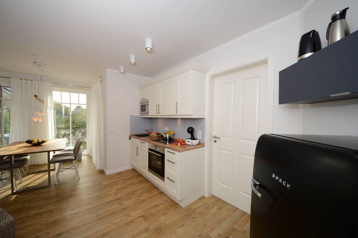 Für Ihre kulinarischen Bedürfnisse steht Ihnen eine offene Küche zur Verfügung, die mit modernen Geräten wie einem Induktionsherd, einem Backofen, einer Mikrowelle sowie einer Spülmaschine ausgestattet ist. Hier können Sie Ihre Lieblingsgerichte zubereiten und im gemütlichen Essbereich genießen. Für Kaffeeliebhaber stellt eine Espressomaschine vom Typ Dolce Gusto, die perfekte Ergänzung dar.