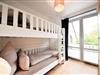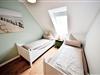 Auch das Schlafzimmer 3 hat einen Zugang zum Balkon. Hier steht ein komfortables Etagenbett, ideal für Kinder und Jugendliche. Im 4. Schlafzimmer mit Dachschräge stehen zwei weitere gemütliche Einzelbetten. Alle Betten werden vor Ihrer Ankunft mit hochwertiger Bio-Baumwollbettwäsche bezogen.