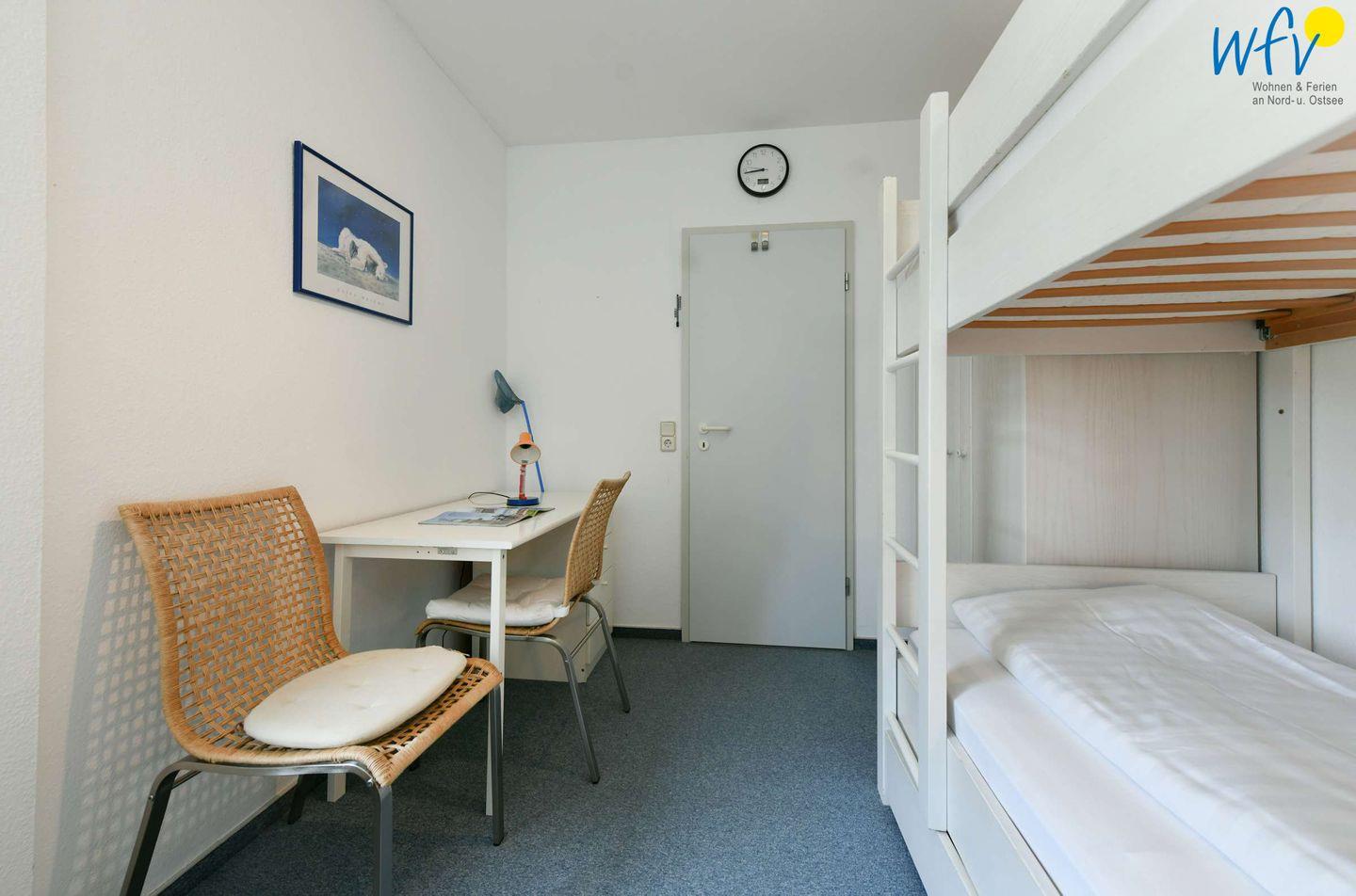 Drei separate Schlafzimmer ermöglichen Ihnen bei einem Urlaub mit mehreren Personen sehr angenehme Aufteilungsmöglichkeiten. Im unteren Bereich befindet sich ein Kinderschlafzimmer mit Etagenbett und kleinem Schreibtisch, im oberen Wohnbereich liegen zwei weitere Schlafzimmer - jeweils mit Doppelbett.