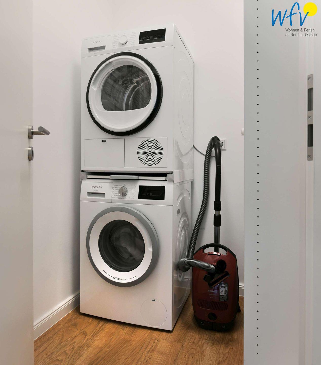 Es sind eine Waschmaschine und ein Trockner zur Eigennutzung vorhanden, außerdem ein Wäscheständer, ein Bügeleisen und ein Bügelbrett sowie ein Staubsauger. Die Böden in Wohn- und Schlafzimmer sind mit allergikerfreundlichem hochwertigem Laminat in Holzbodenoptik verlegt. Für Fahrräder gibt es einen Abstellplatz. Haustiere sind nicht erlaubt, wir bitten um Verständnis.