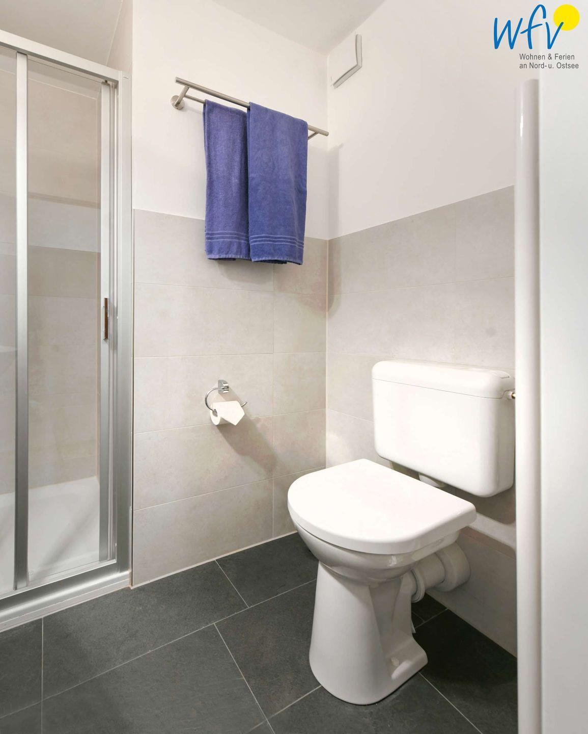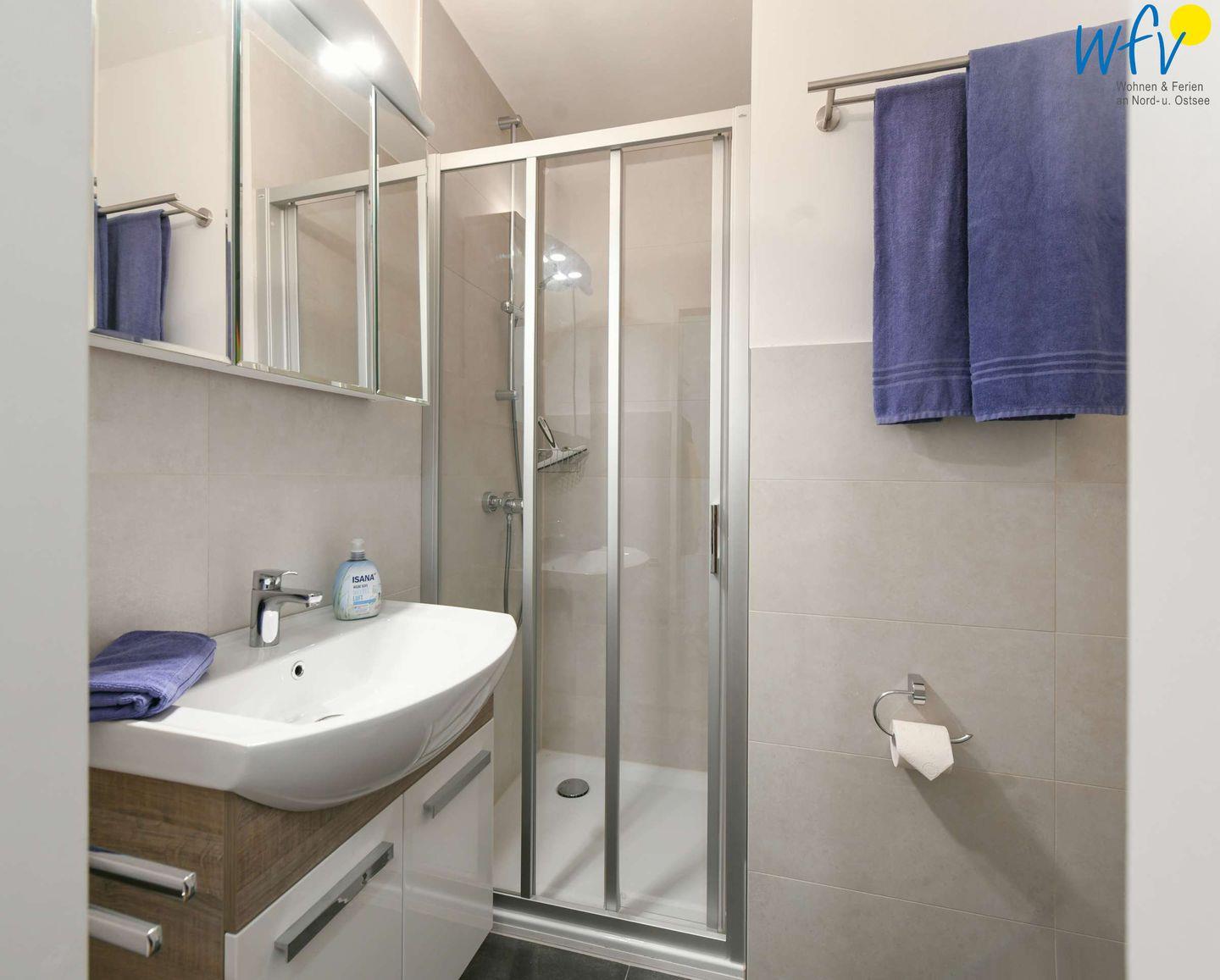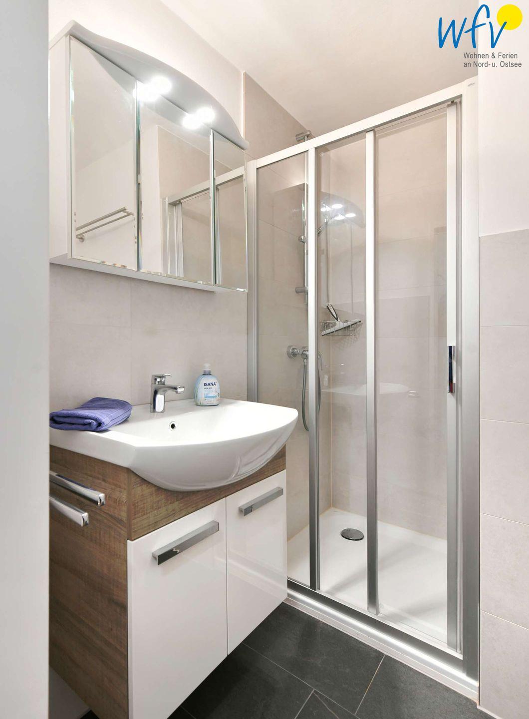 Das moderne Bad ist mit Dusche, Waschbecken, beleuchtetem Spiegelschrank, Föhn und WC ausgestattet.