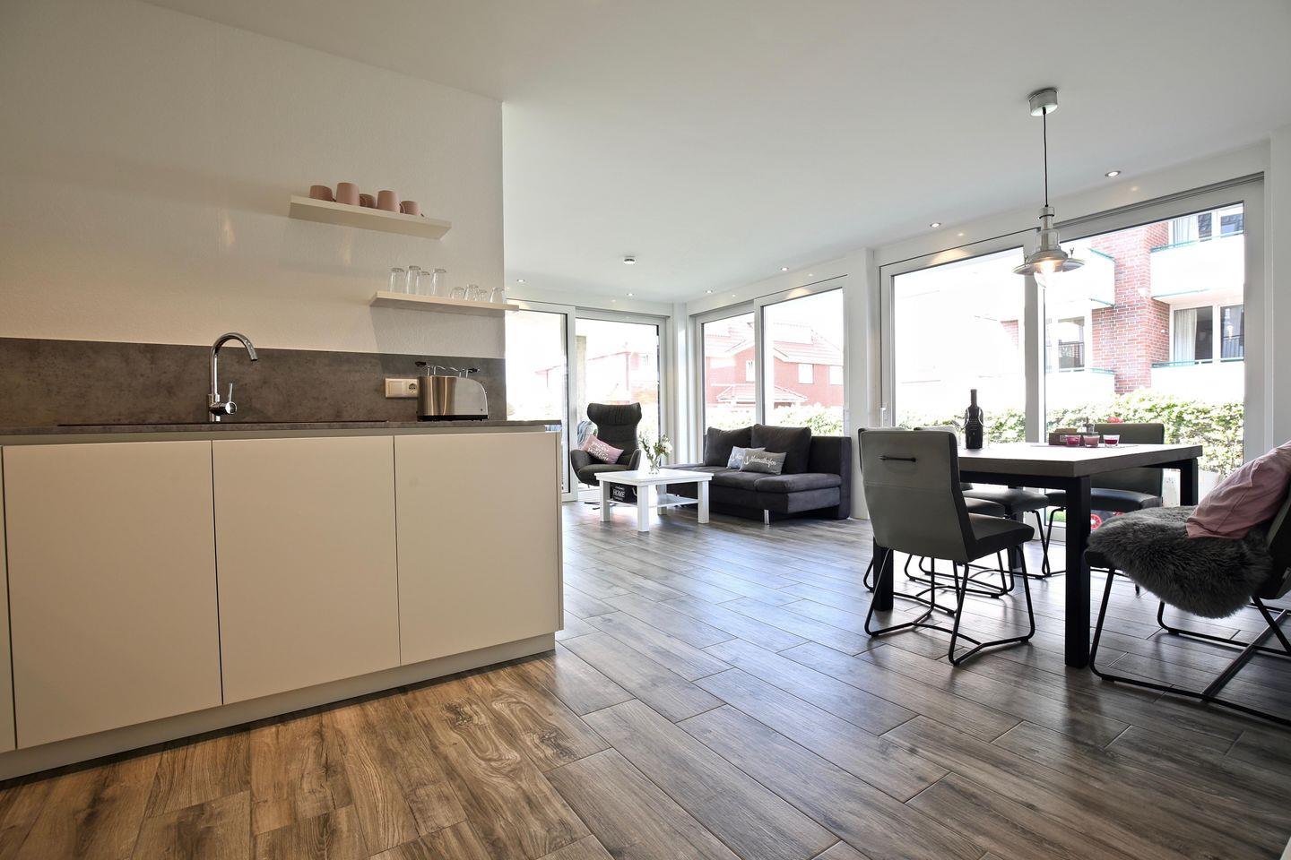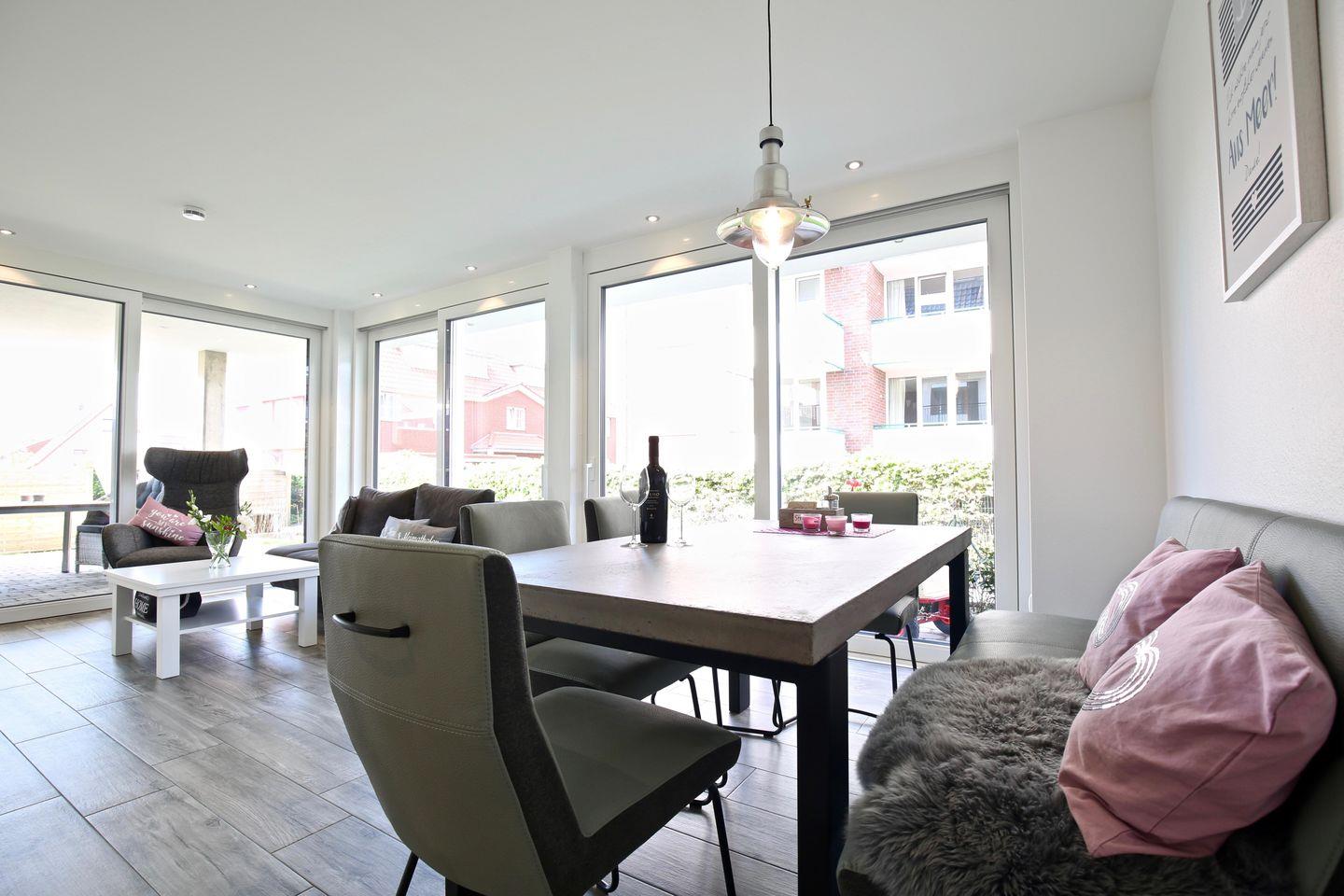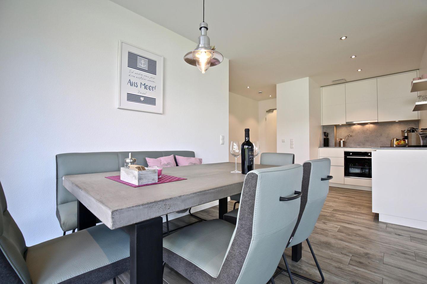 Vom Wohn-Essbereich aus haben Sie einen direkten Zugang zur hochwertig möblierten Terrasse. Eine moderne Einbauküche mit Backofen, Kühlschrank mit Gefrierfach und Spülmaschine ermöglicht Ihnen eine angenehme Selbstverpflegung. Ebenfalls steht ein Waschtrockner in der Wohnung zur Verfügung.