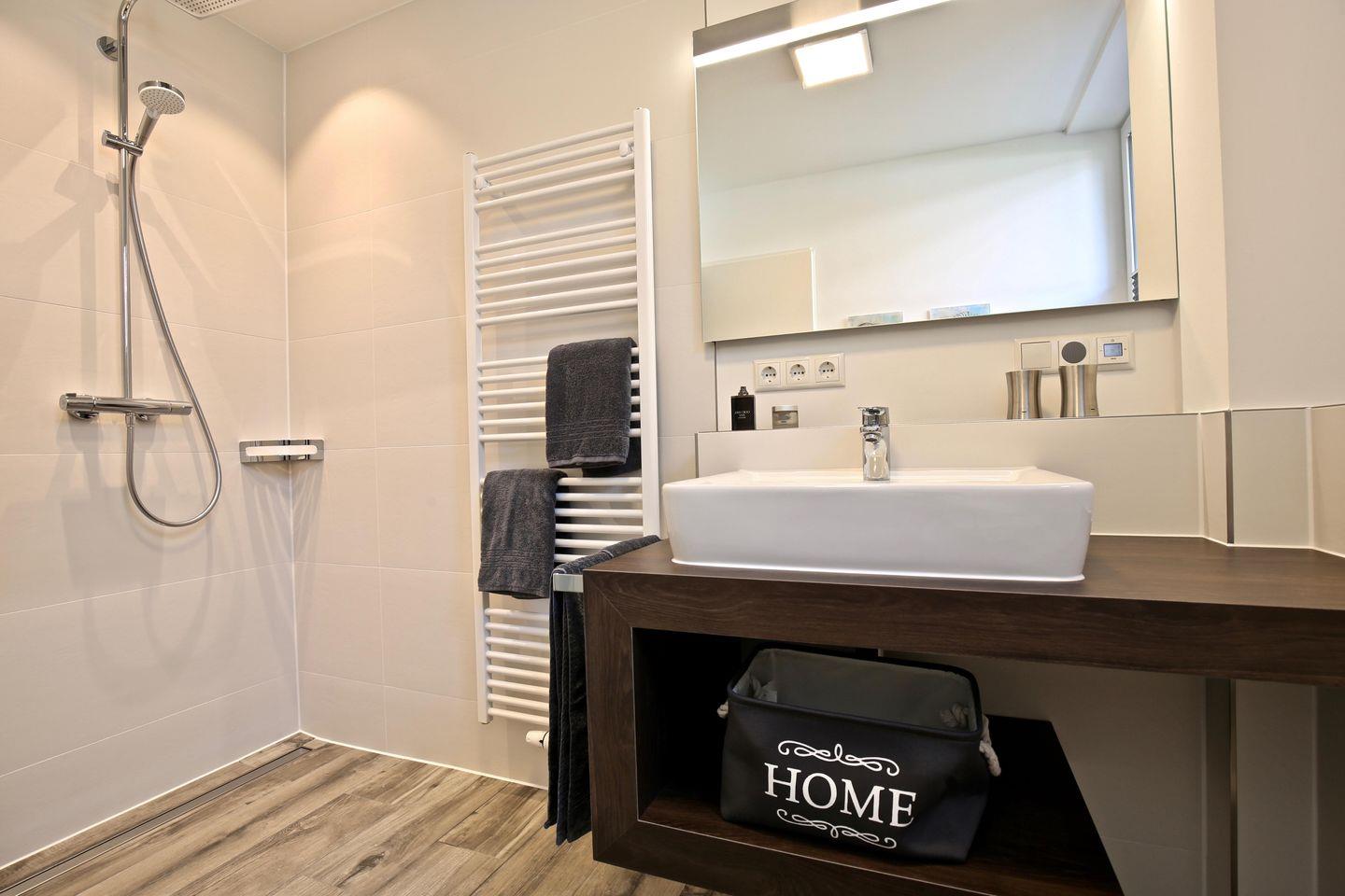 Das hochwertige Badezimmer ist mit einer Regendusche und Internetradio ausgestattet.