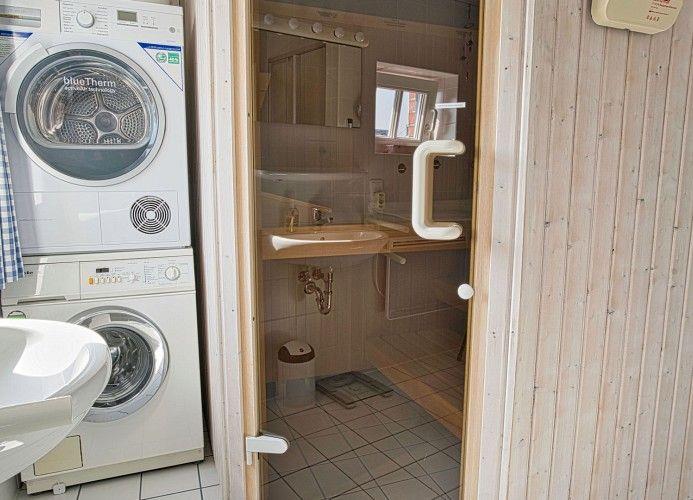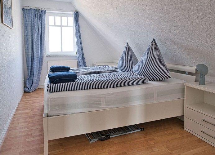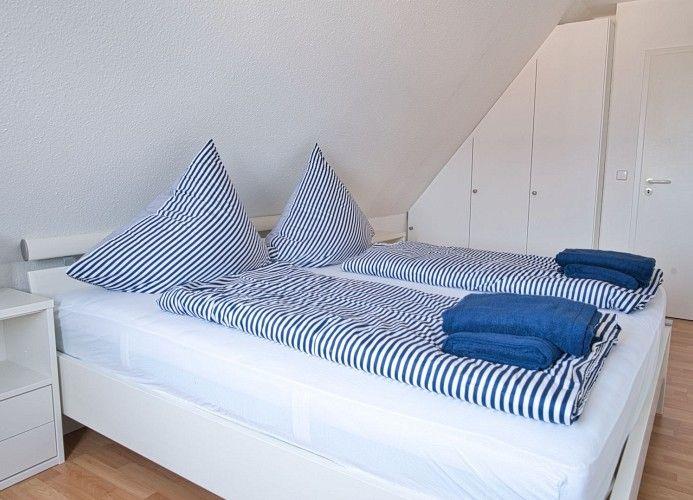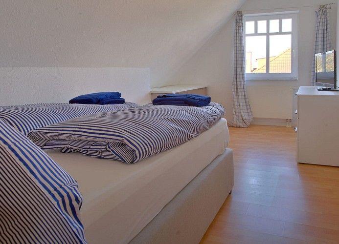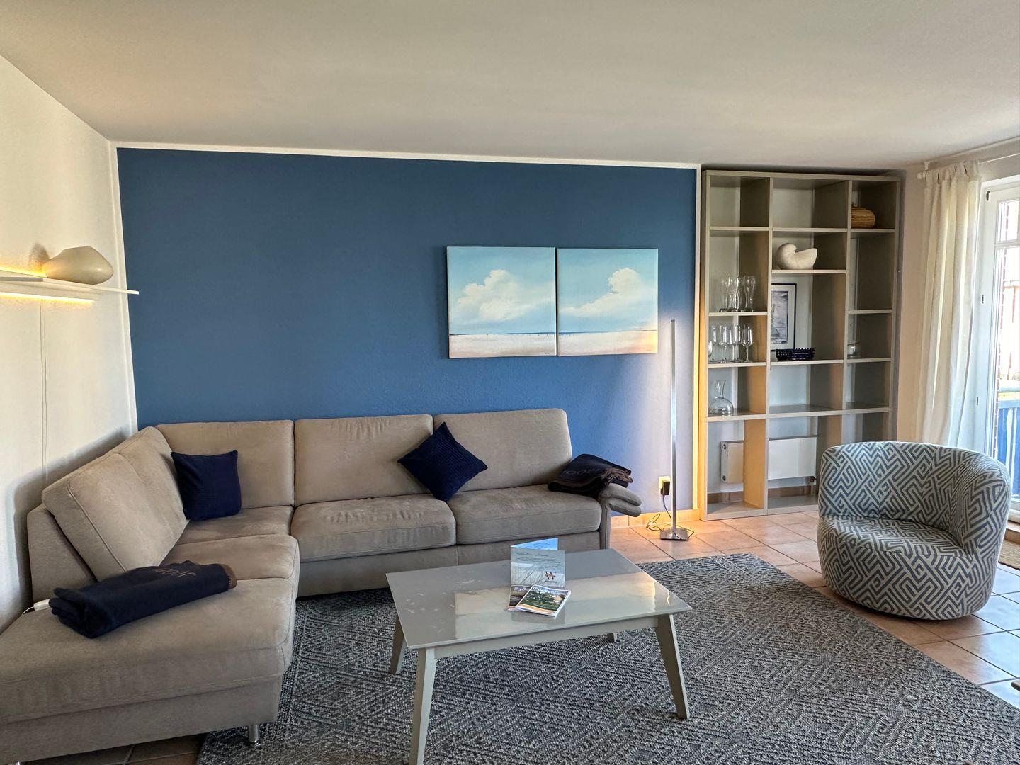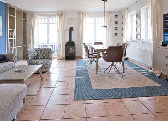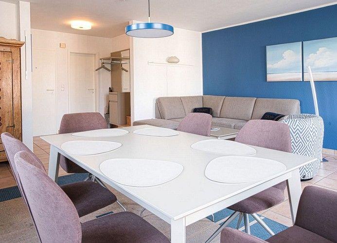Die großzügige Wohnung mit einer Fläche von 97 m² bietet Platz für bis zu sechs Personen und überzeugt durch drei gemütliche Schlafzimmer, die Ihnen und Ihren Mitreisenden einen erholsamen Schlaf garantieren. Zwei moderne Badezimmer sorgen dafür, dass es donnerstags zu keinen Wartezeiten kommt, während die gut ausgestattete Küche zum gemeinsamen Kochen und Genießen einlädt. Im gemütlichen Wohnzimmer können Sie sich nach einem langen Strandtag entspannen, während Sie den Blick auf die grünen Wiesen der Umgebung genießen.