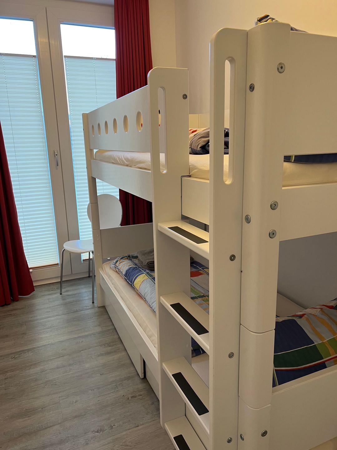 Schlafzimmer und Bad machen die kinderfreundliche Wohnung zu einer Insel der