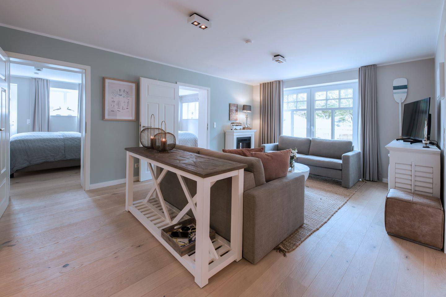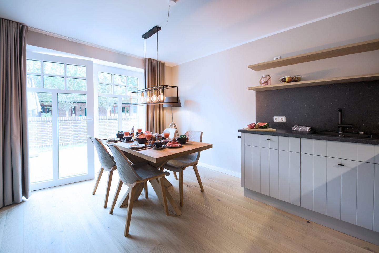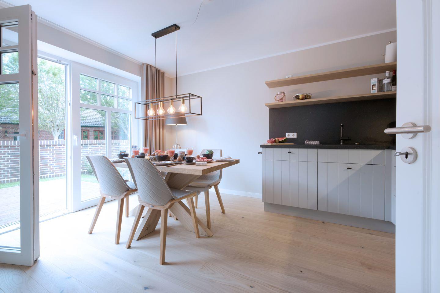 Die moderne und gemütliche Ferienwohnung im Erdgeschoß bietet Raum für bis zu 6 Personen. Der großzügige und sonnendurchflutete Wohnraum ist mit einer gemütlichen Sofaecke (Schlafsofa), Flat-Screen Fernseher und einem gemütlichen Kaminofen ausgestattet. Genießen Sie die Wangerooger Sonne im eigenen großen Garten mit zwei separaten Terrassen, der zum Verweilen und Spielen einlädt. Die separate und luxuriösen Küche ist voll ausgestattet und bietet am großen Esstisch Platz für 6 Personen.