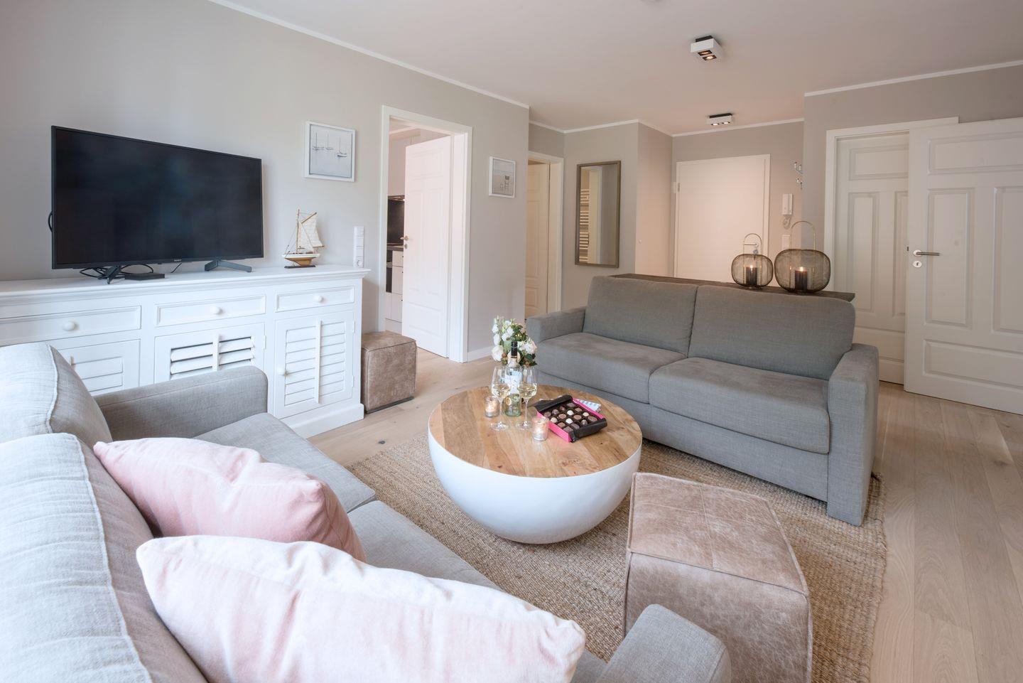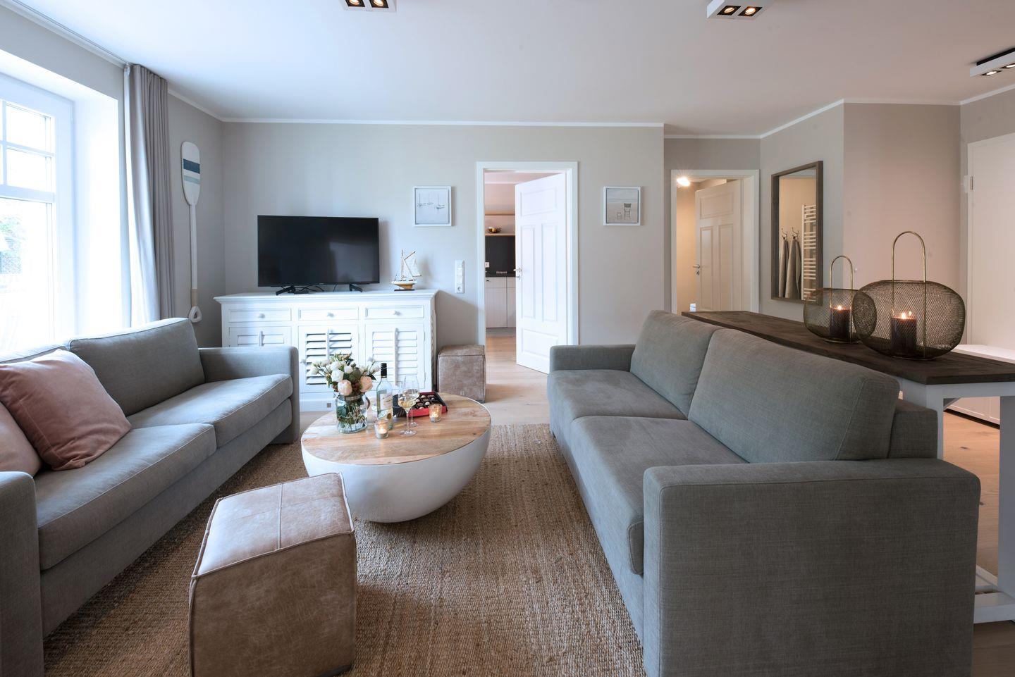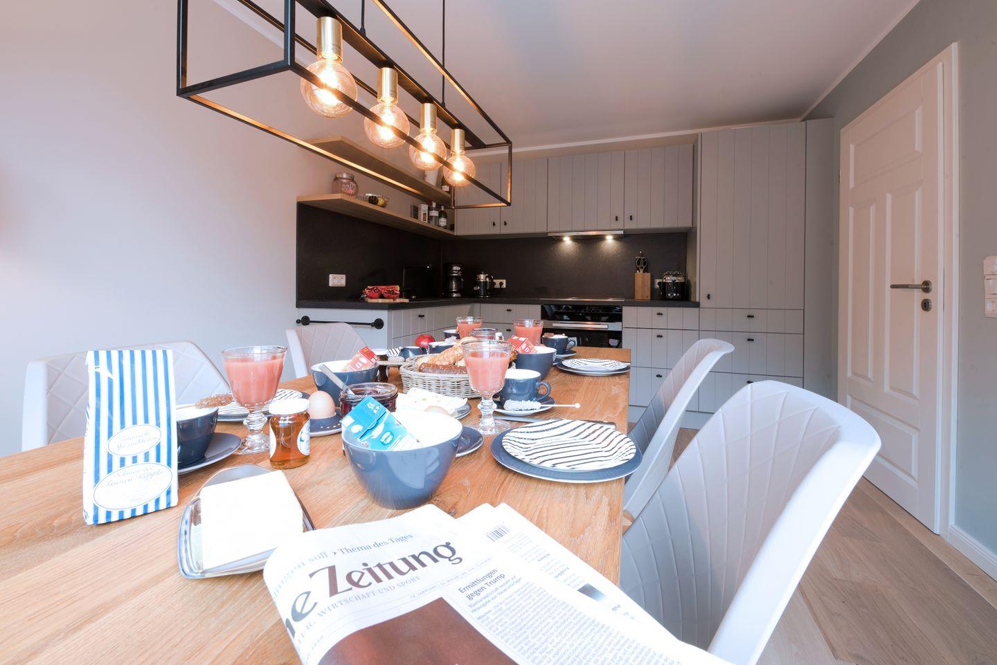 Die moderne und gemütliche Ferienwohnung im Erdgeschoß bietet Raum für bis zu 6 Personen. Der großzügige und sonnendurchflutete Wohnraum ist mit einer gemütlichen Sofaecke (Schlafsofa), Flat-Screen Fernseher und einem gemütlichen Kaminofen ausgestattet. Genießen Sie die Wangerooger Sonne im eigenen großen Garten mit zwei separaten Terrassen, der zum Verweilen und Spielen einlädt. Die separate und luxuriösen Küche ist voll ausgestattet und bietet am großen Esstisch Platz für 6 Personen.