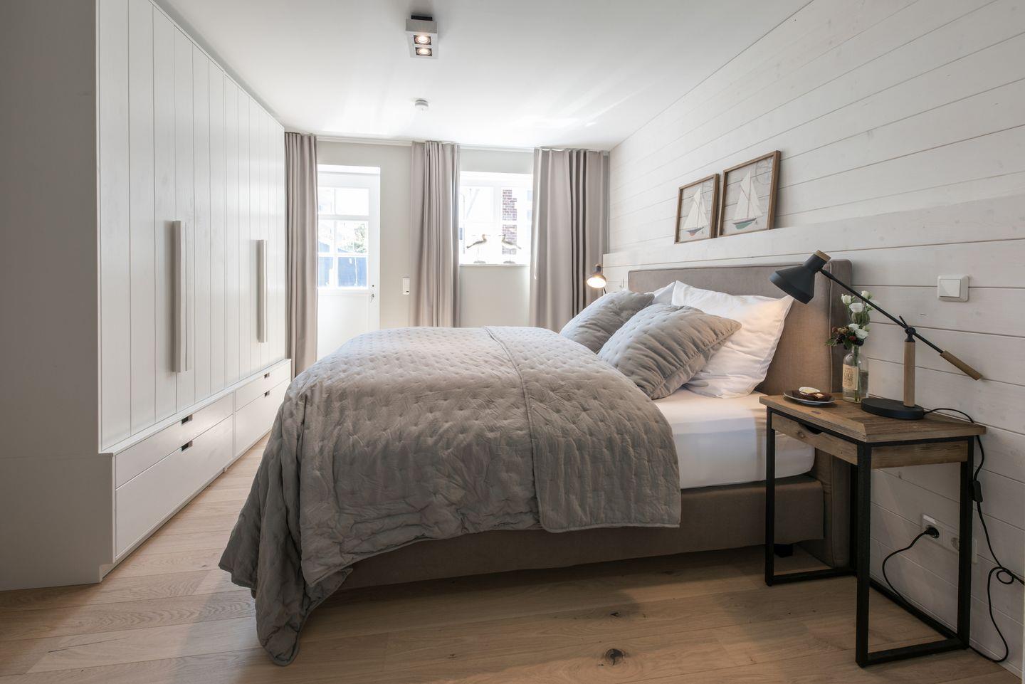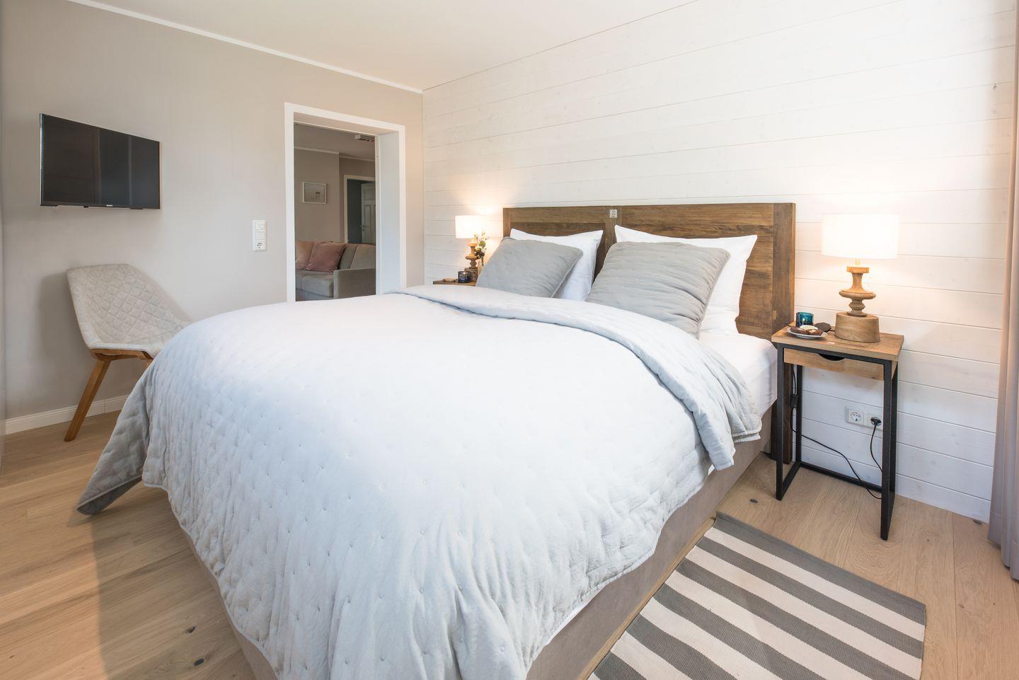 Vom Wohnraum aus erreichen Sie zwei Schlafzimmer mit komfortablen Boxspring-Doppelbetten und Flat-Screen Fernsehern. Zusätzlich enthält die Wohnung ein vollwertiges, modernes Badezimmer, sowie einen Abstellraum mit Waschmaschine und Trockner. In dieser Nichtraucher Ferienwohnung sind keine Haustiere gestattet.