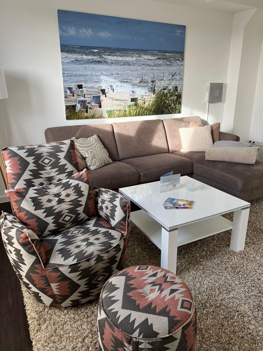 große Ferienwohnung WoogePrima in der Residenz "Anna See" verfügt über ein großzügiges Wohnzimmer mit einer großen Liegecouch zum gemütlichen Entspannen und Genießen. Der moderne Küchenbereich mit Esstisch ist komplett und hochwertig ausgestattet. Die exquisite Wohnung wird im Süden, Osten und Norden komplett von einem 32 m² großen Balkon umgeben. Im Norden mit Meerblick und im Süden mit Blick auf das Wattenmeer und die Zedeliusstraße. Von jedem der durch die bodentiefen Fenster lichtdurchfluteten Räume hat man Zutritt zum Balkon. Die Wohnung verfügt über 2 Schlafzimmer (eins davon sogar mit Meerblick) und ein luxuriöses Bad mit Dusche, WC und Bidet. Prima Ausstattung Hochwertige Möbel, eine große und urgemütliche Liege-Couch, ein riesiger Fernseher; ein Blu-Ray Player und ein Soundsystem, eine qualitativ hochwertige Küchenaustattung, hochwertige Betten, ein großes modernes Bad mit Bidet und der wunderbare Balkon mit Meerblick bieten weit mehr als es bei einer normalen Ferienwohnung üblich ist. Prima Lage Nur 50 Meter vom Strand entfernt in unmittelbarer Nähe der Strandpromenade und des Cafe Puddings gelegen sind Sie in der Residenz Anna See mitten im Geschehen von Wangerooge. Diese Ferienwohnung ist eine Nichtraucherwohnung; Haustiere sind nicht erlaubt.