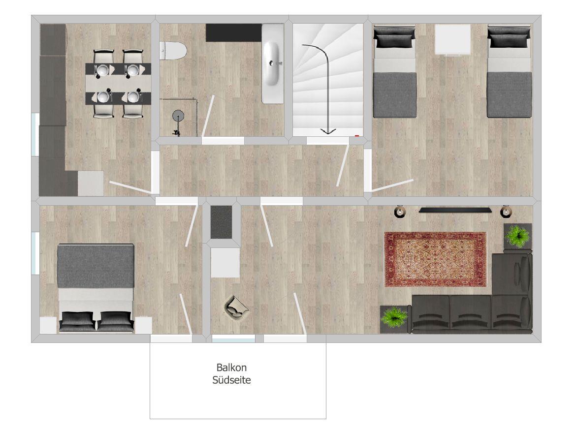 Kleinkind bis zu 3 Jahren (Babybett) mit 2 Schlafzimmern, 1 Bad, separater Küche, Wohnzimmer mit Süd-Balkon und Fenstern zu allen 4 Seiten einen