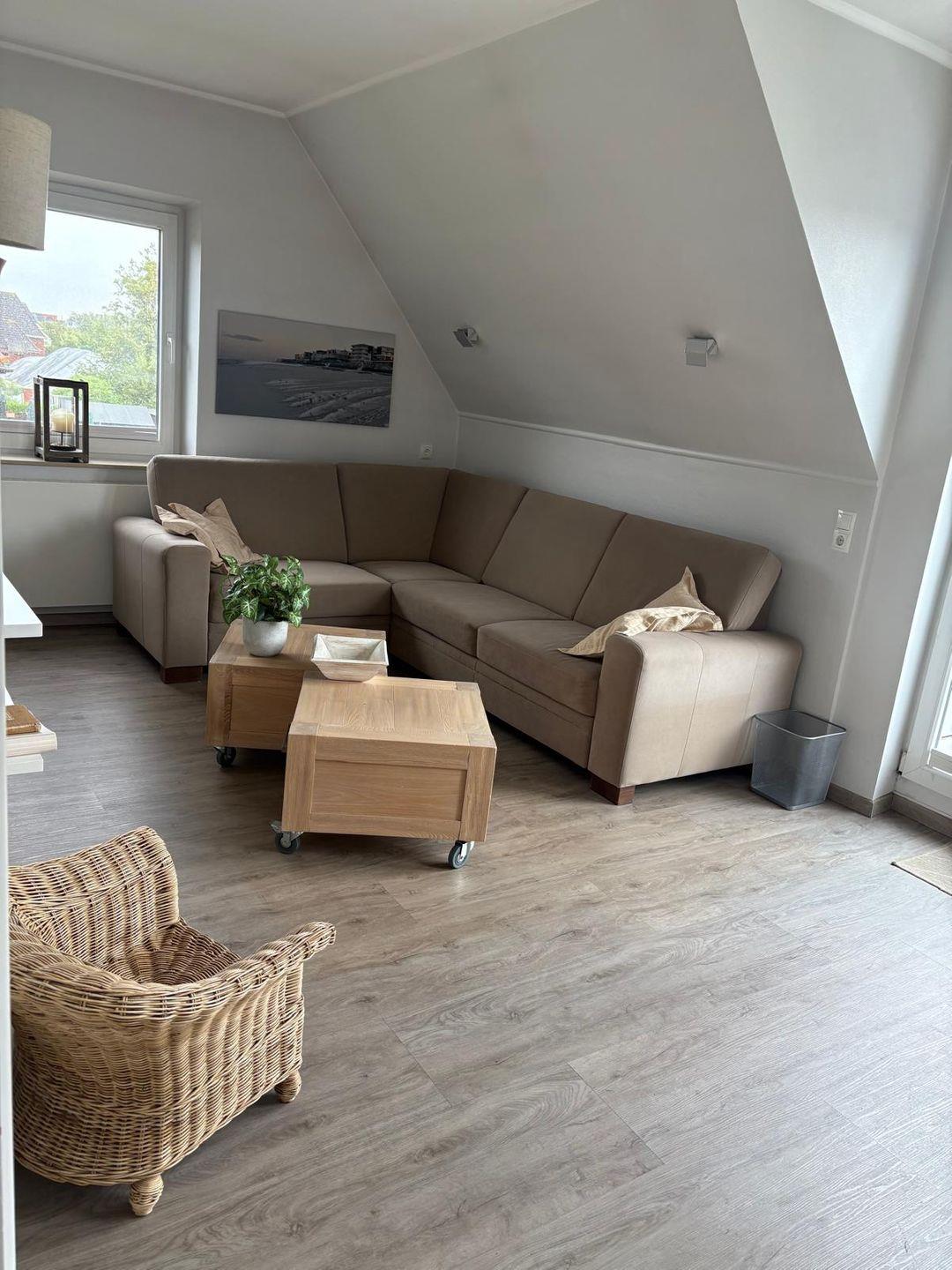 sonnendurchfluteten Lebensraum. Das Wohnzimmer hat ein modernes Ecksofa mit ausziehbarer Fußstütze zum gemütlichen Entspannen.
