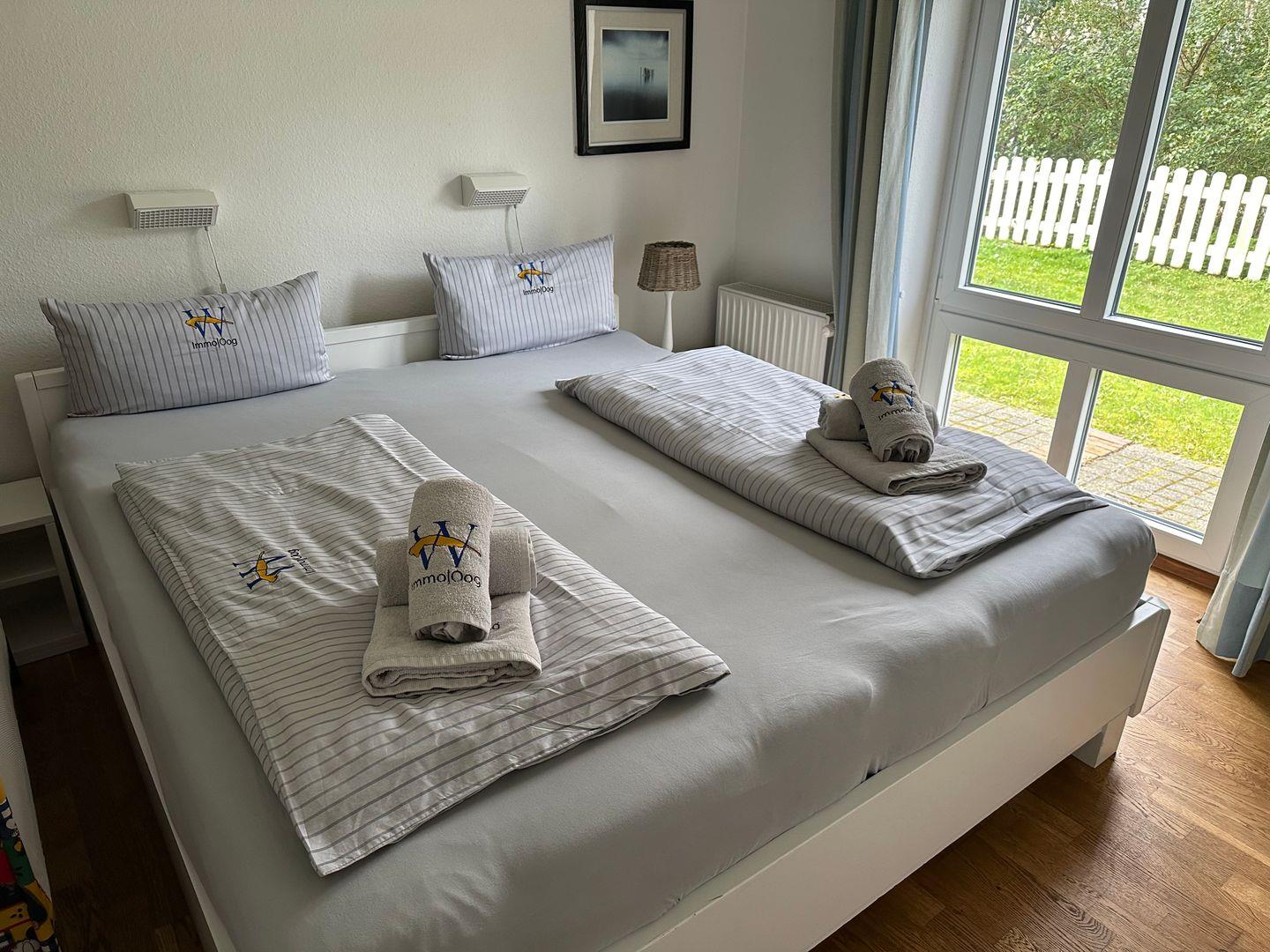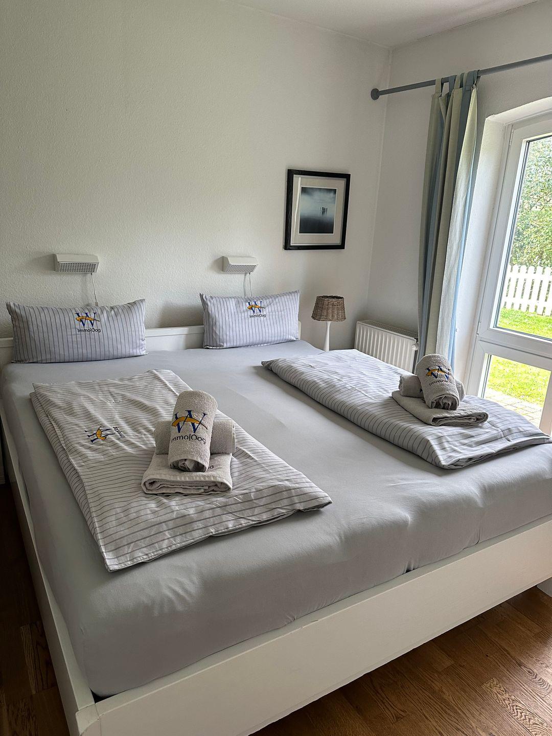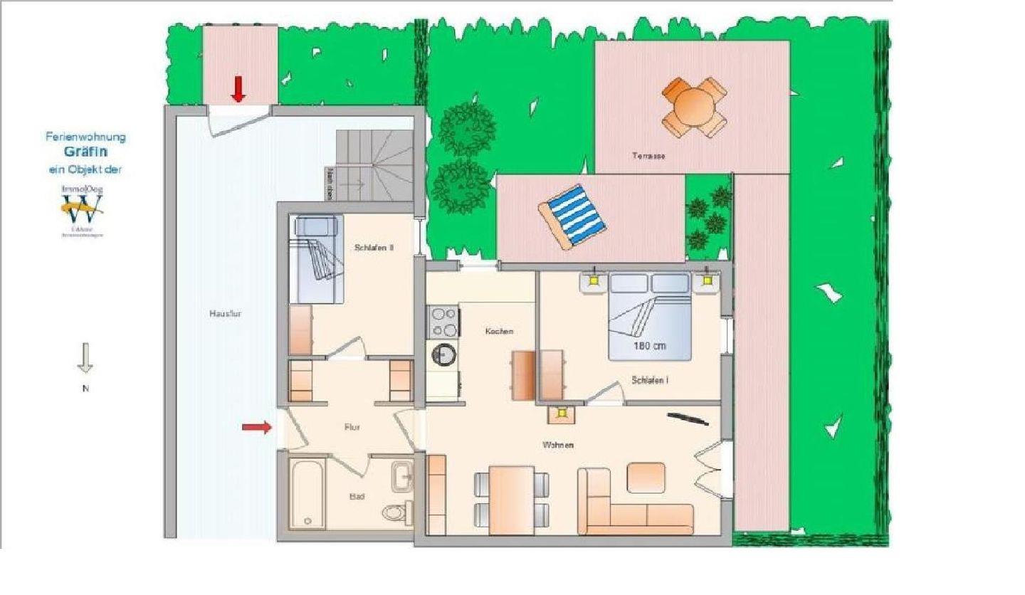Die Ferienwohnung ist ebenerdig mit Terrasse und Garten (Südwest - ausgestattet mit Gartenmöbeln und Strandkorb) in bevorzugter, ruhiger und dennoch zentraler Lage. Die Wohnung hat ein Schlafzimmer mit Doppelbett und ein weiteres Zimmer mit zwei separaten Betten. Das Bad wurde kürzlich renoviert und hat eine Dusch-/ Badewanne. Im Wohnraum befindet sich der Essbereich mit angrenzender Küche und ein gemütliches Ecksofa zum Entspannen vor dem TV. Nichtraucherwohnung; Hunde sind willkommen.