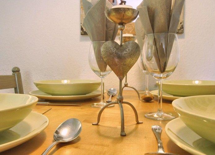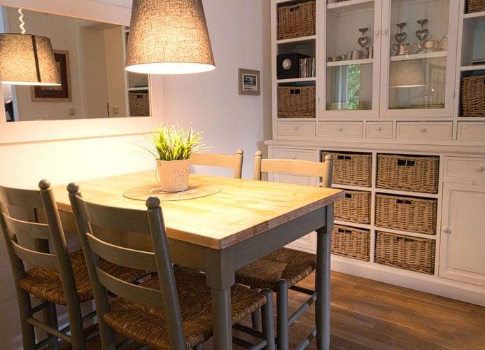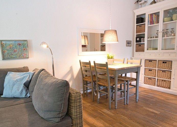 Im Wohnraum befindet sich der Essbereich mit angrenzender Küche und ein gemütliches Ecksofa zum bequemen Entspannen vor dem TV. Hier steht auch ein kleiner elektrischer Kamin. Vom Wohnraum geht es zur Terrasse, ausgestattet mit Gartenmöbeln und einem „Wangerooger Strandkorb“.