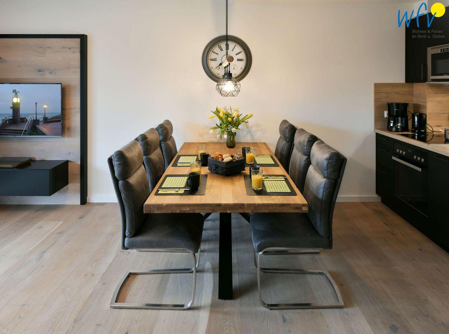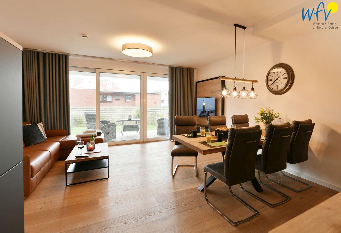 Der helle Lichteinfall, stilvolle Möbel in harmonischer Farbgebung und maritime Accessoires sorgen für schönes Flair und das entsprechende Nordseegefühl! Hochwertige Parkettböden sowie Fußbodenheizung bieten zusätzlichen Wohnkomfort. Der Essplatz mit Blick nach draußen lädt zum ausgiebigen Ferienfrühstück ein, die Couchecke mit modernem TV zu gemütlichen Stunden am Abend und die komfortablen Betten in den separaten Schlafzimmern zum langen Ausschlafen.