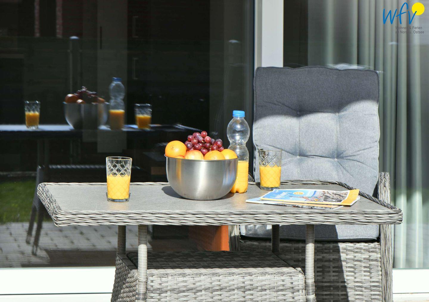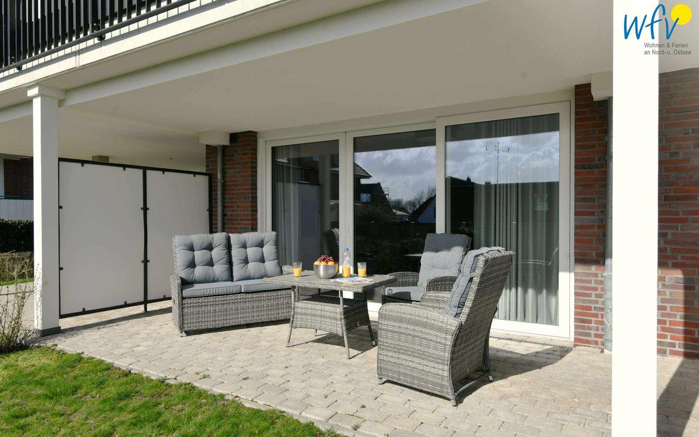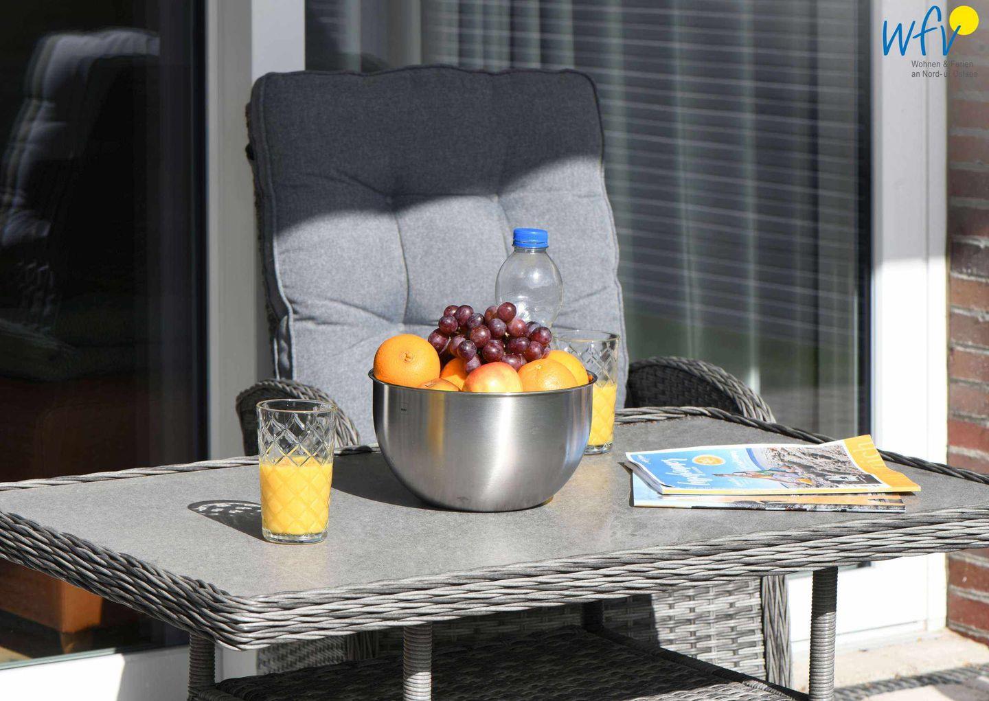 Auch auf der hübsch möblierten Terrasse der Ferienwohnung können Sie absolut relaxen! Sonne tanken, wohltuende Nordseeluft schnuppern oder in der Hängematte die Seele baumeln lassen - das sind wunderbare Wohlfühlmomente. In Ihrem Urlaub so lange Sie möchten... Einfach herrlich! Ihre Kinder haben währenddessen Spaß im angrenzenden Garten.