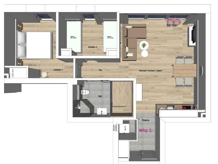 Wenn auf Wangerooge die Sonne untergeht, warten in den zwei separaten Schlafzimmern bequeme Doppelbetten auf Sie! Vom Bett aus können Sie gemütlich fernsehen (in einem der Zimmer). Optional können auf Anfrage noch zwei Personen auf dem Sofa schlafen, welches sich zum bequemen Bett umfunktionieren lässt.