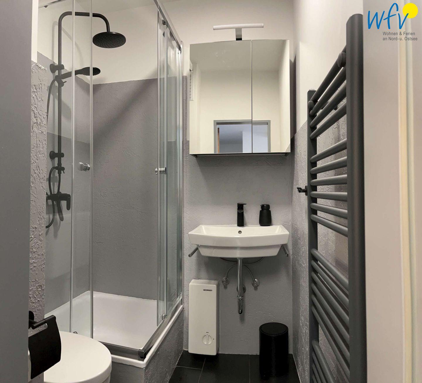 Das elegante Badezimmer ist mit WC, Waschbecken, Dusche und Handtuchheizung ausgestattet.