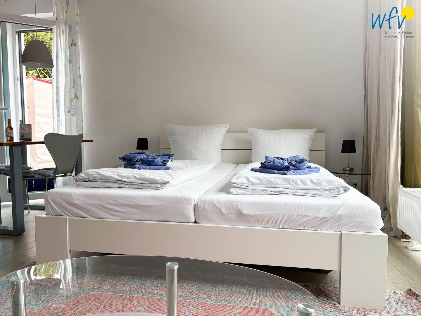 Herrlich ausschlafen können Sie in dem komfortablen Doppelbett (2 x 90 cm x 200 cm) der Ferienwohnung! Für Ihre Urlaubsgarderobe ist Platz im geräumigen Kleiderschrank.
