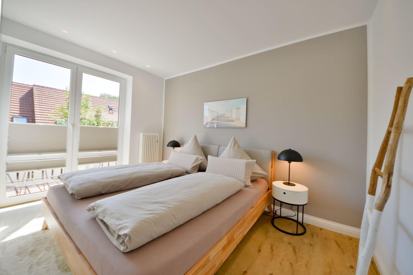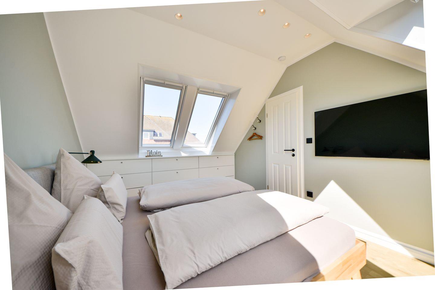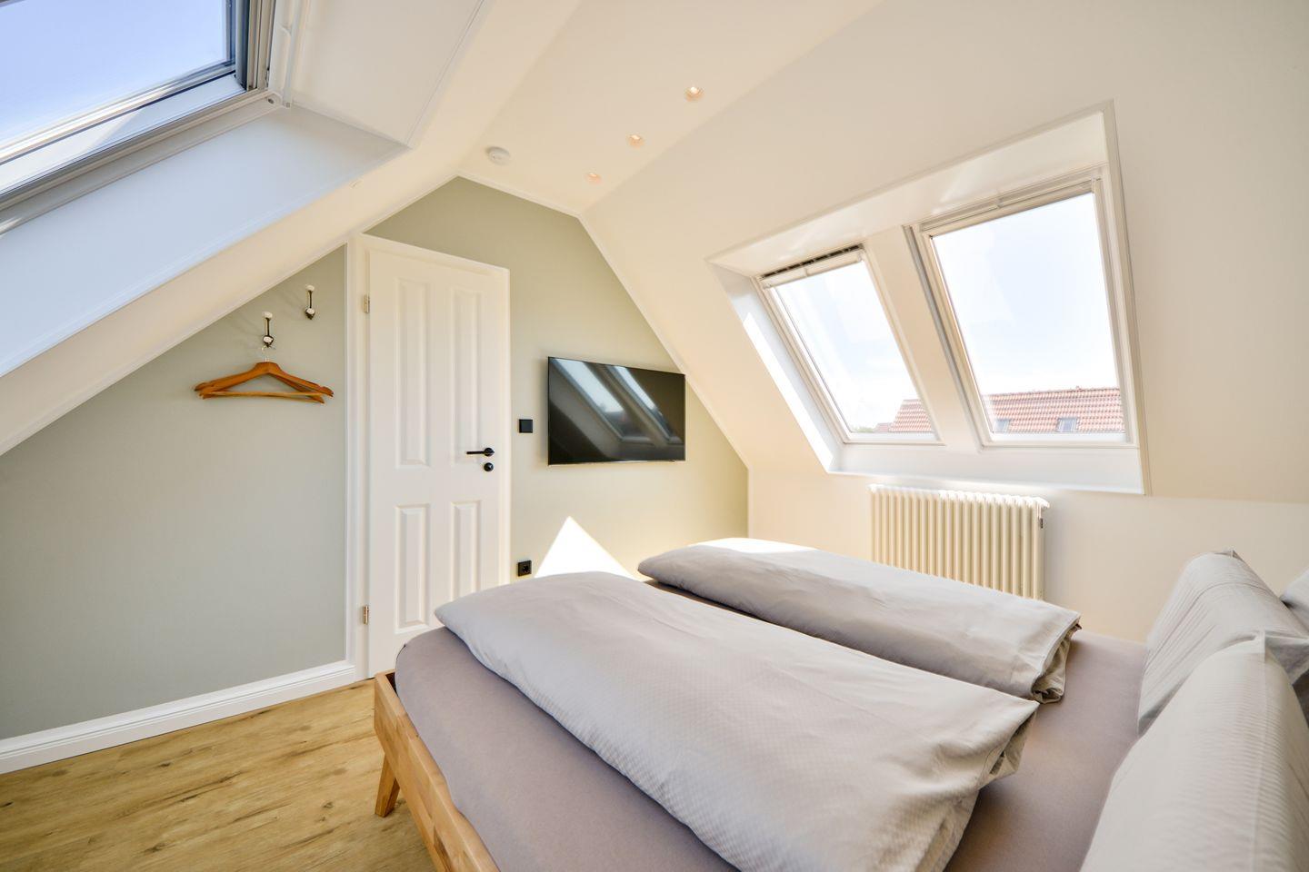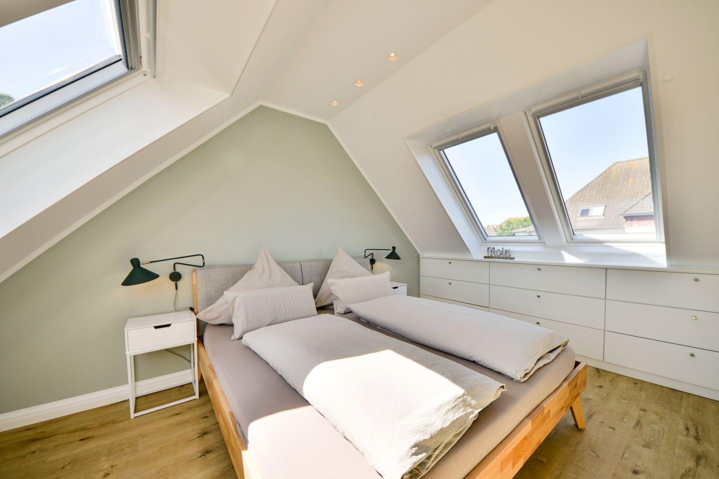 Auch das Schlafzimmer 3 hat einen Zugang zum Balkon. Hier steht ein komfortables Etagenbett, ideal für Kinder und Jugendliche. Das 4. Schlafzimmer befindet sich im Spitzboden. Dieses wurde als Master-Bedroom eingerichtet und verfügt über ein en Suite-Duschbad.