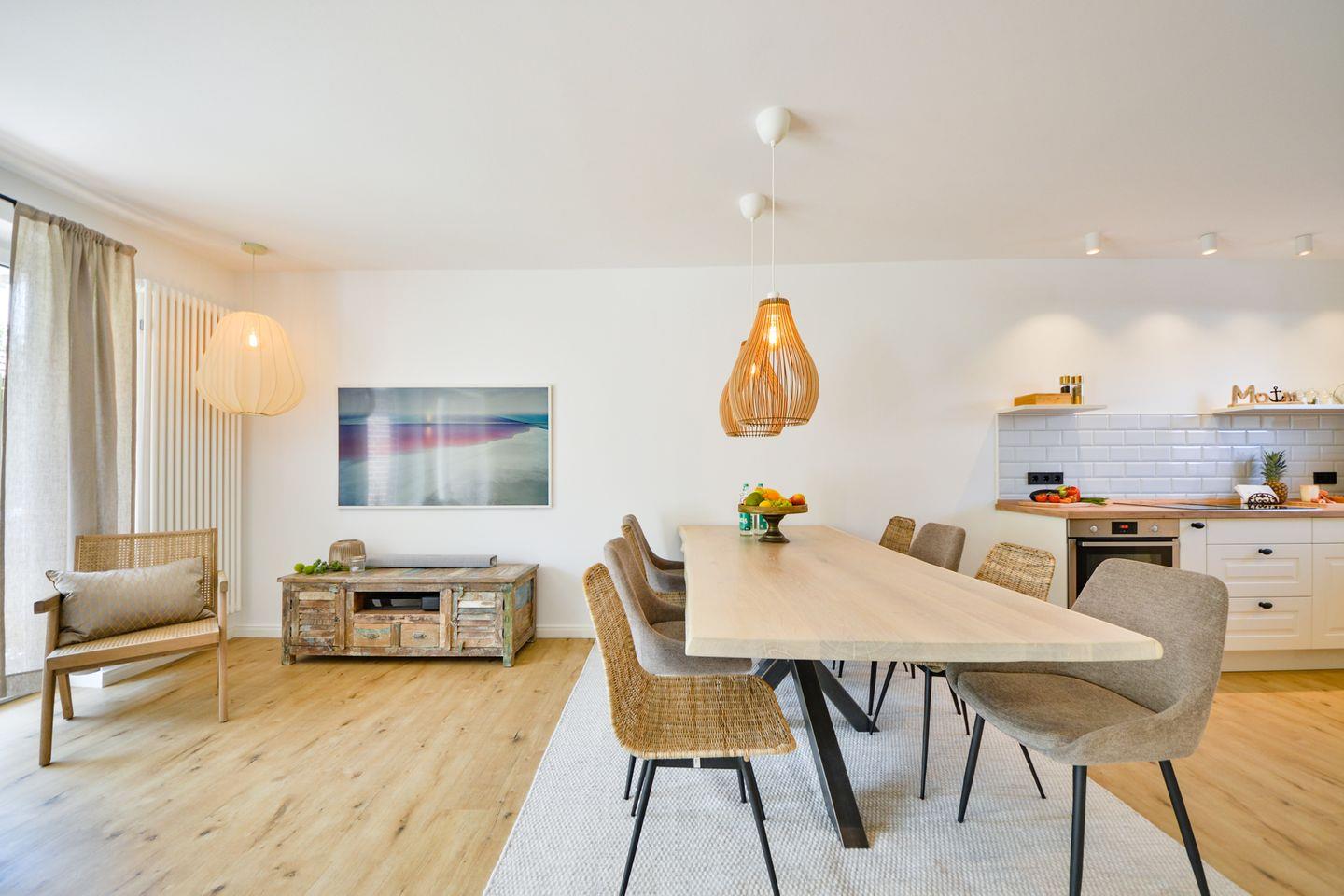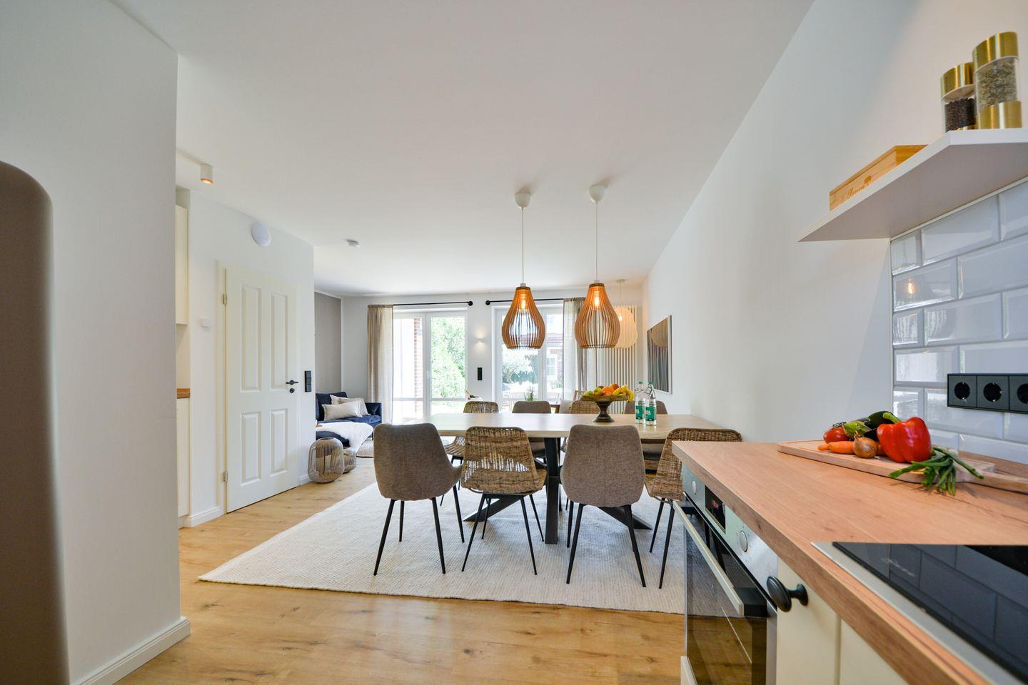 Direkt nach dem Betreten des kleinen gemütlichen Flures offenbart sich der Blick in das geräumige Ess- und Wohnzimmer mit offener Küche. Hier erwartet euch ein großer Esstisch, an dem alle acht Personen und ein Kleinkind Platz finden. Als kleines Willkommensgeschenk stellen wir euch dort einen Obstkorb und Mineralwasser bereit.