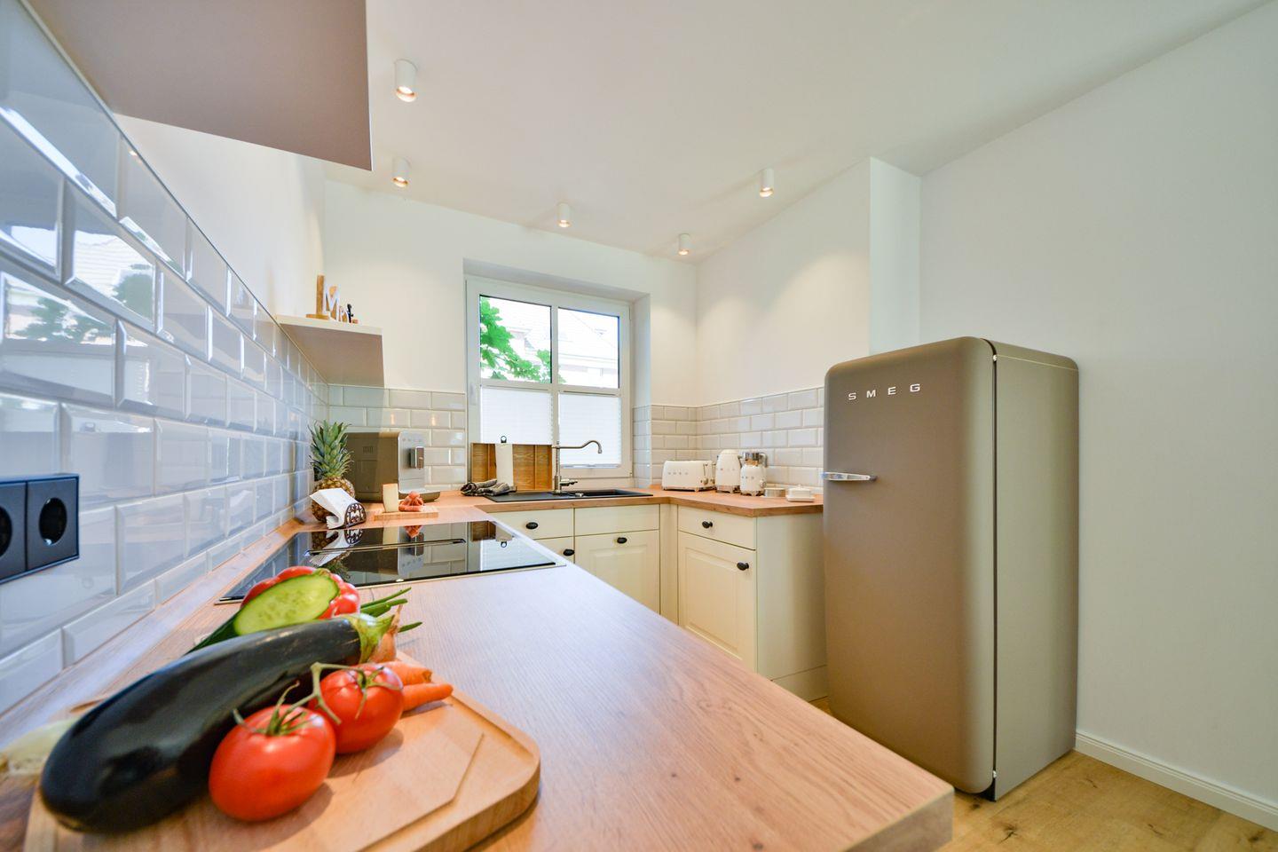 Die Küche im modernen Design ist voll ausgestattet. Sie bietet genug Platz und Möglichkeiten sich komplett selbst zu versorgen. Selbstverständlich ausgestattet mit Geschirrspüler, Backofen, Kaffeemaschine, Toaster, Wasserkocher und vieles mehr.