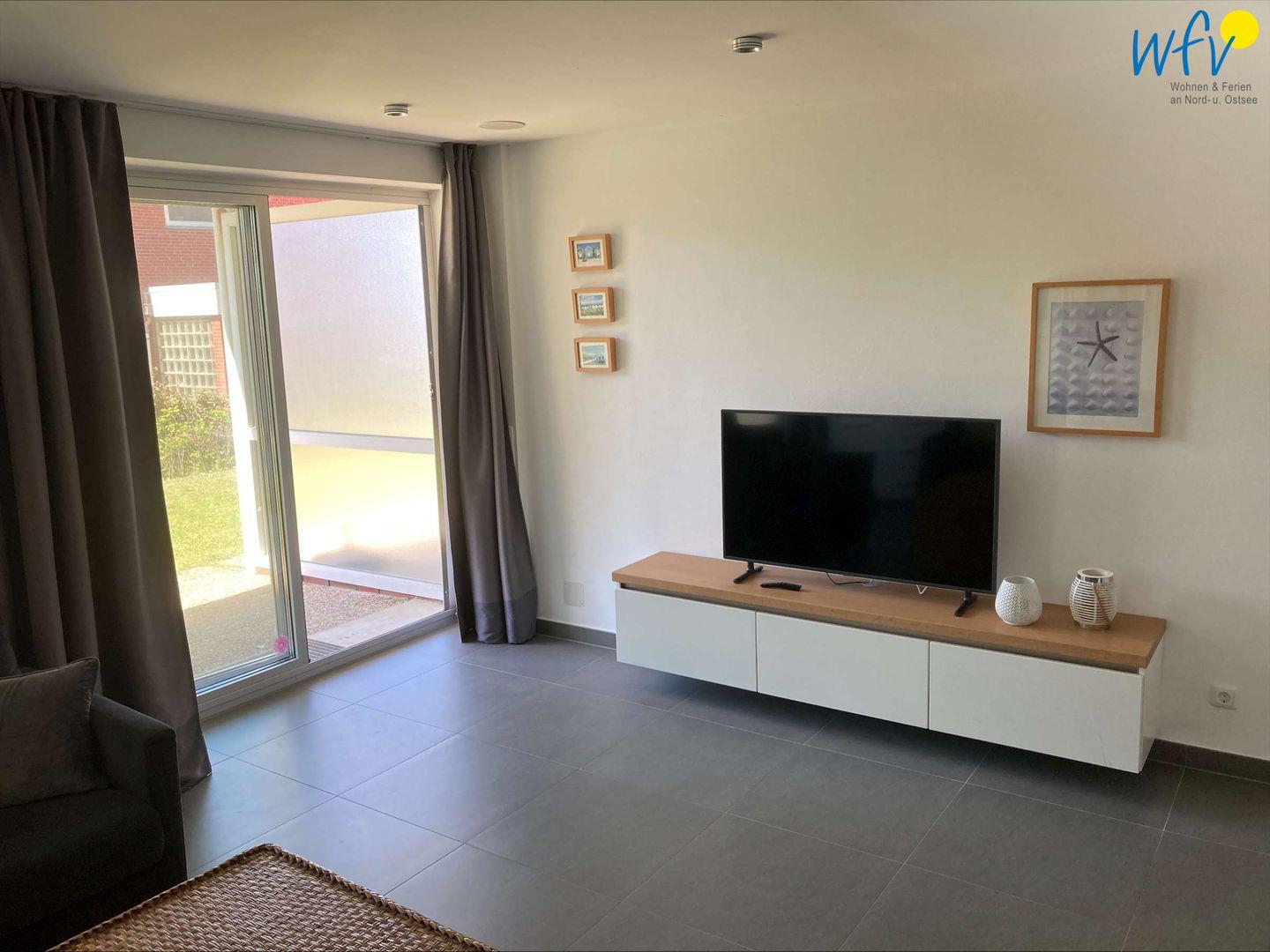 Wohltuende Nordseeluft können Sie in vollen Zügen auf der hübsch möblierten Terrasse der Ferienwohnung genießen! Vom angrenzenden Gartengrundstück haben Sie einen schönen Blick auf das Meer (seitlich).