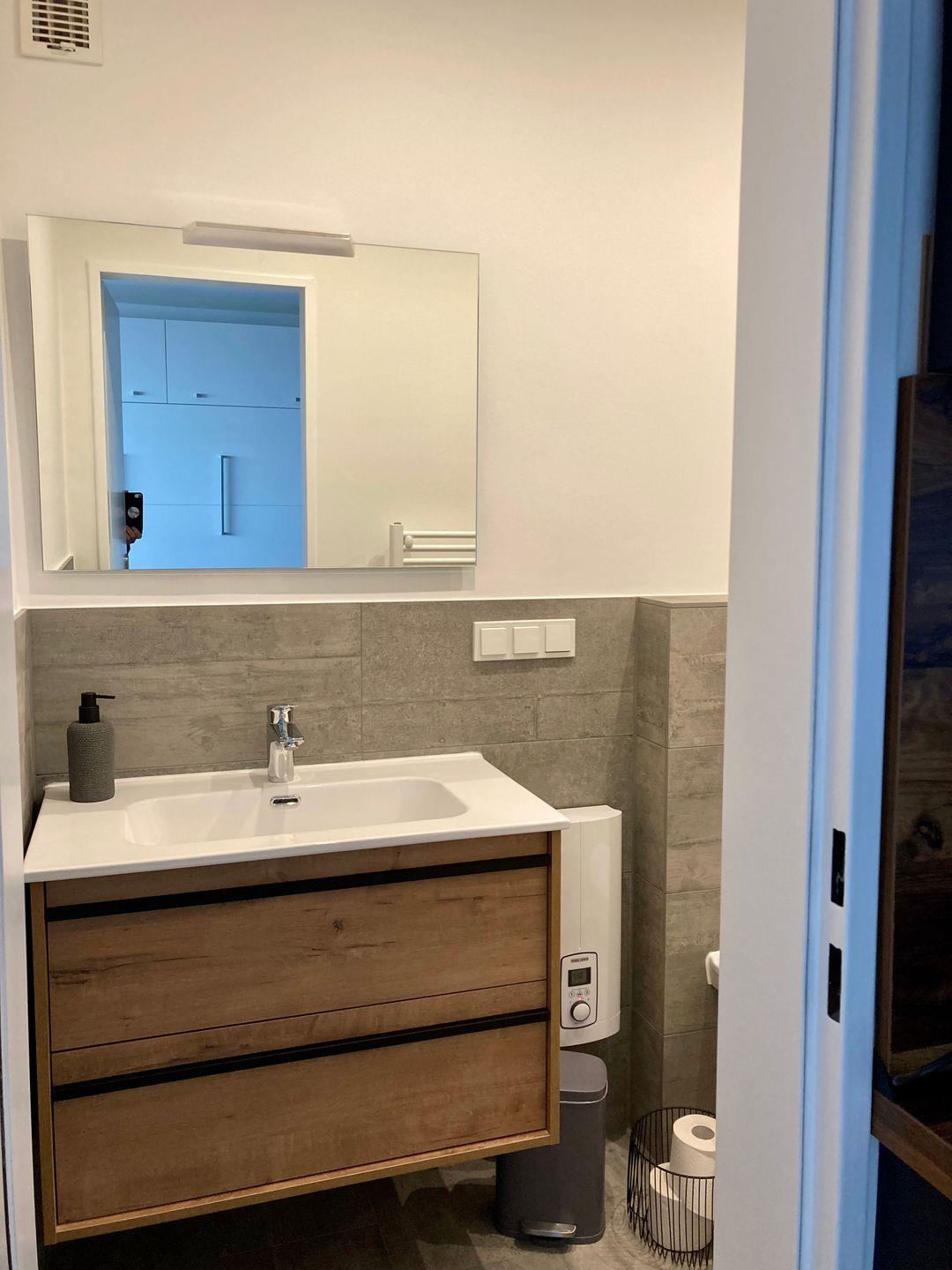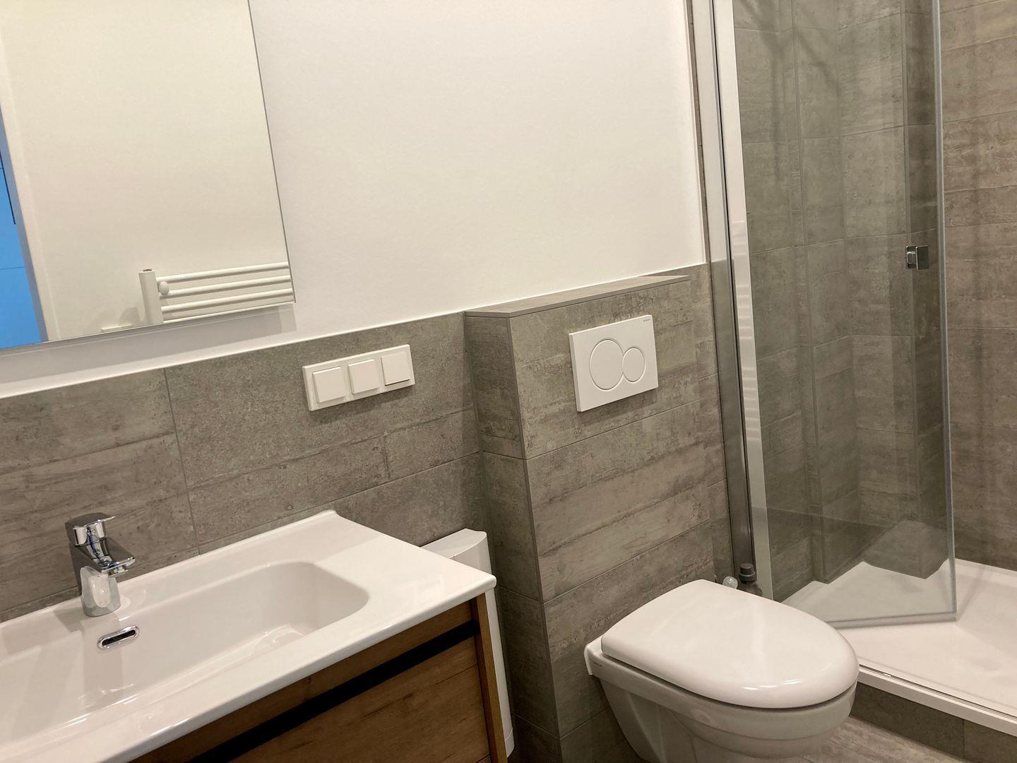 Das ebenfalls neu renovierte Badezimmer ist hell u freundlich gefliest und verfügt zudem über eine Dusche