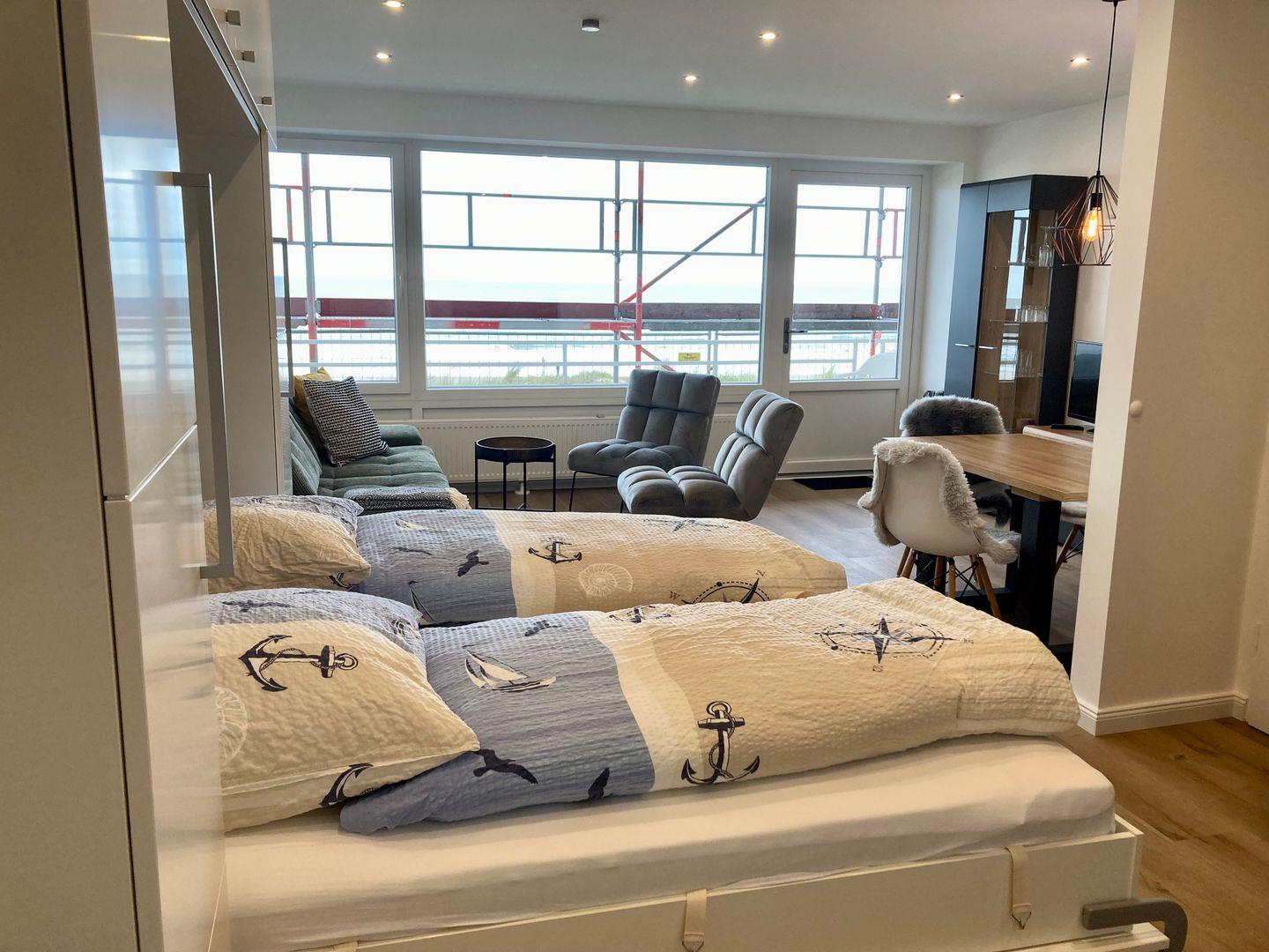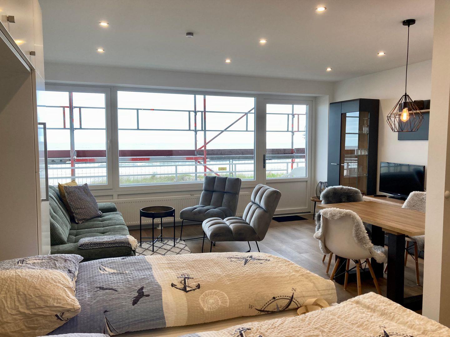 Dieses Einraumappartement befindet sich im Hochparterre des Haus Monopol in erster Strandlage. Aus jeder Ecke dieser Unterkunft kann man das Meer sehen und genießen