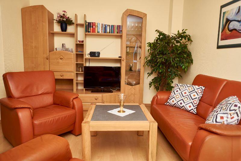 3 -Sterne-Wohnung, etwa. 55 m2 groß, bestehend aus einem Wohnraum, einem großen Schlafzimmer sowie einem kleinen Schlafzimmer, einem Duschbad und einem großen Südbalkon. Im großen Schlafzimmer gibt es ein Doppelbett, im kleinen Schlafzimmer befindet sich ein Bett, das eine Größe von 2 x 0,80 m hat und auf eine Größe von 2m x 1,60m erweitert werden kann. Optional kann zusätzlich ein Kinderbett aufgebaut werden. Im Wohnzimmer befindet sich eine gemütliche Couchecke aus Leder, ein großer LED-Farbfernseher mit sowie ein Radio. Auch ist im Wohnraum eine komplett ausgestattete Küchenzeile mit Mikrowelle, Spül- sowie Kaffeemaschine und ein Wasserkocher installiert. Wlan stellen wir kostenlos bereit.